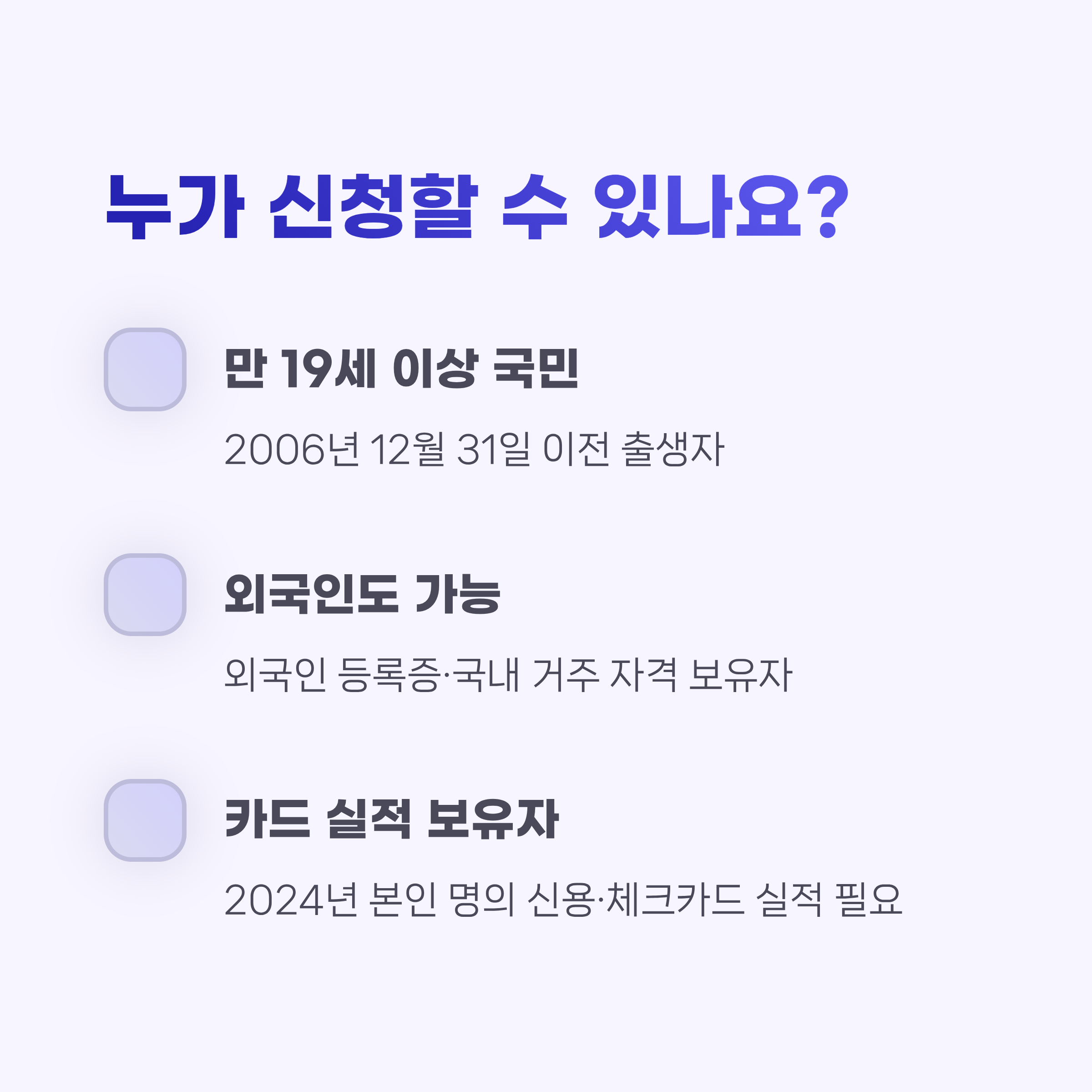 - 2024년 본인 명의의 신용·체크카드 실적이 있는 사람