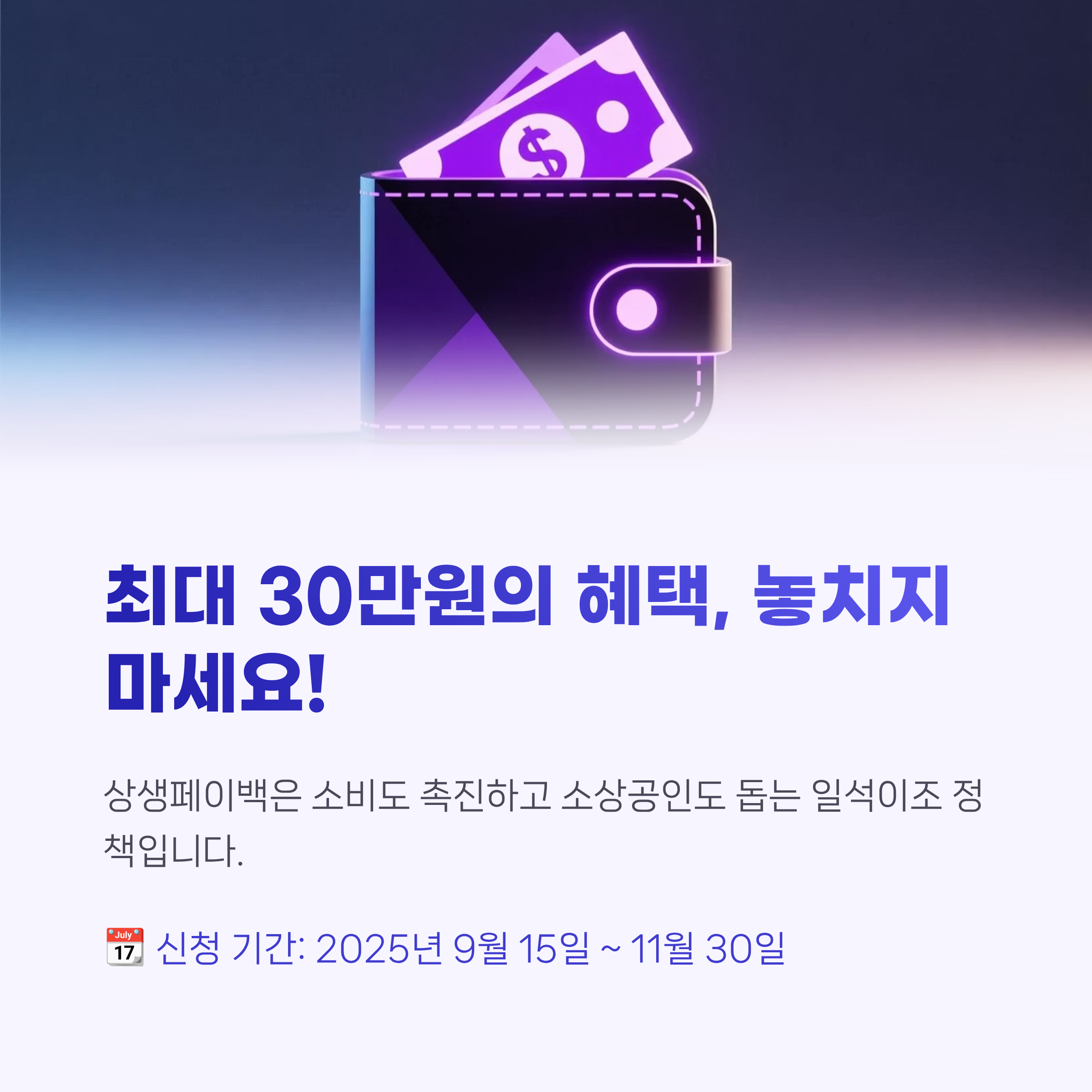 상생페이백은 최대 30만 원까지 환급 혜택을 받을 수 있는 좋은 기회입니다. 신청 자체가 간단하고, 사용처도 전국적으로 넓어 실생활에서 유용하게 활용할 수 있습니다.