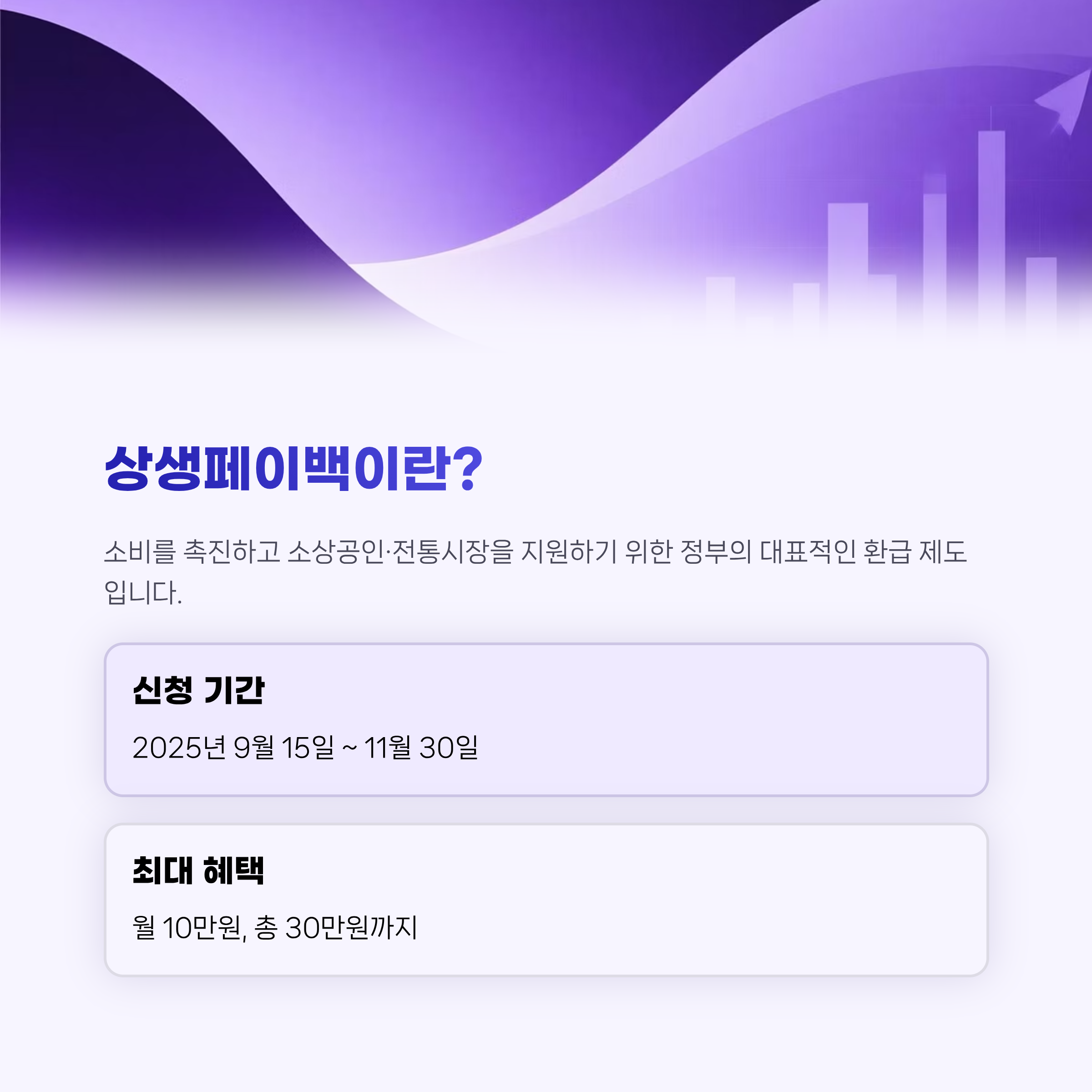 정부가 추진하는 상생페이백 정책은 소비를 촉진하고 소상공인·전통시장을 지원하기 위한 대표적인 환급 제도입니다. 2025년 하반기부터 본격 시행되는 이번 정책은 신청대상, 지급금액, 신청방법이 명확하게 정해져 있어, 조건만 충족하면 누구나 혜택을 받을 수 있습니다.