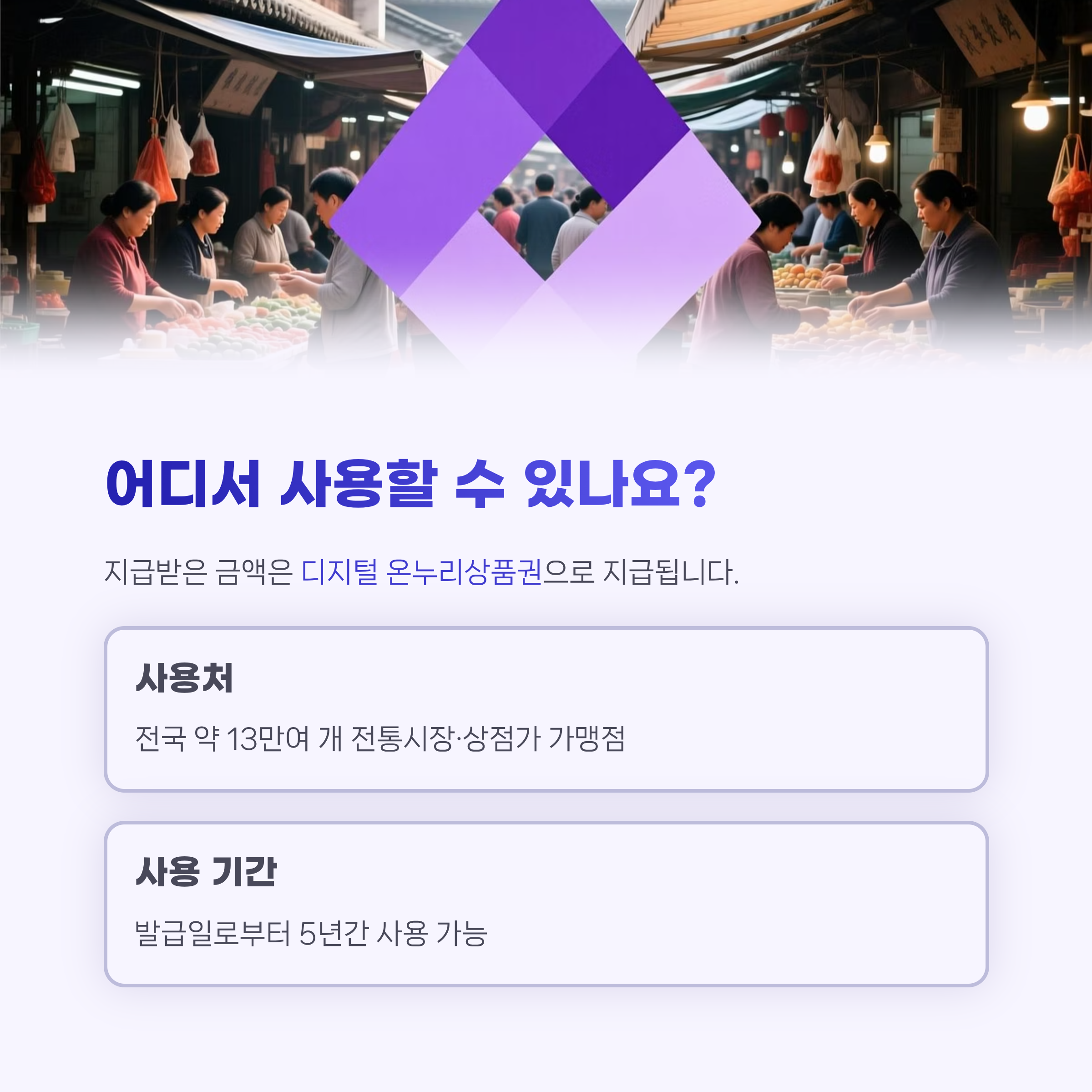 - 사용처: 전국 약 13만여 개 전통시장·상점가 가맹점