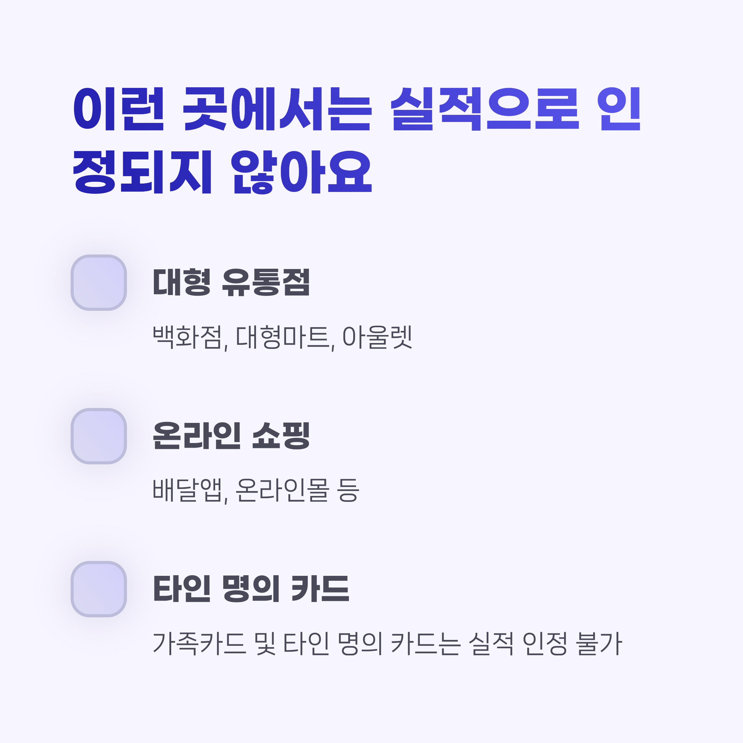 - 실적 제외 항목: 백화점, 대형마트, 아울렛, 배달앱, 온라인몰 등 일부 업종은 인정되지 않음