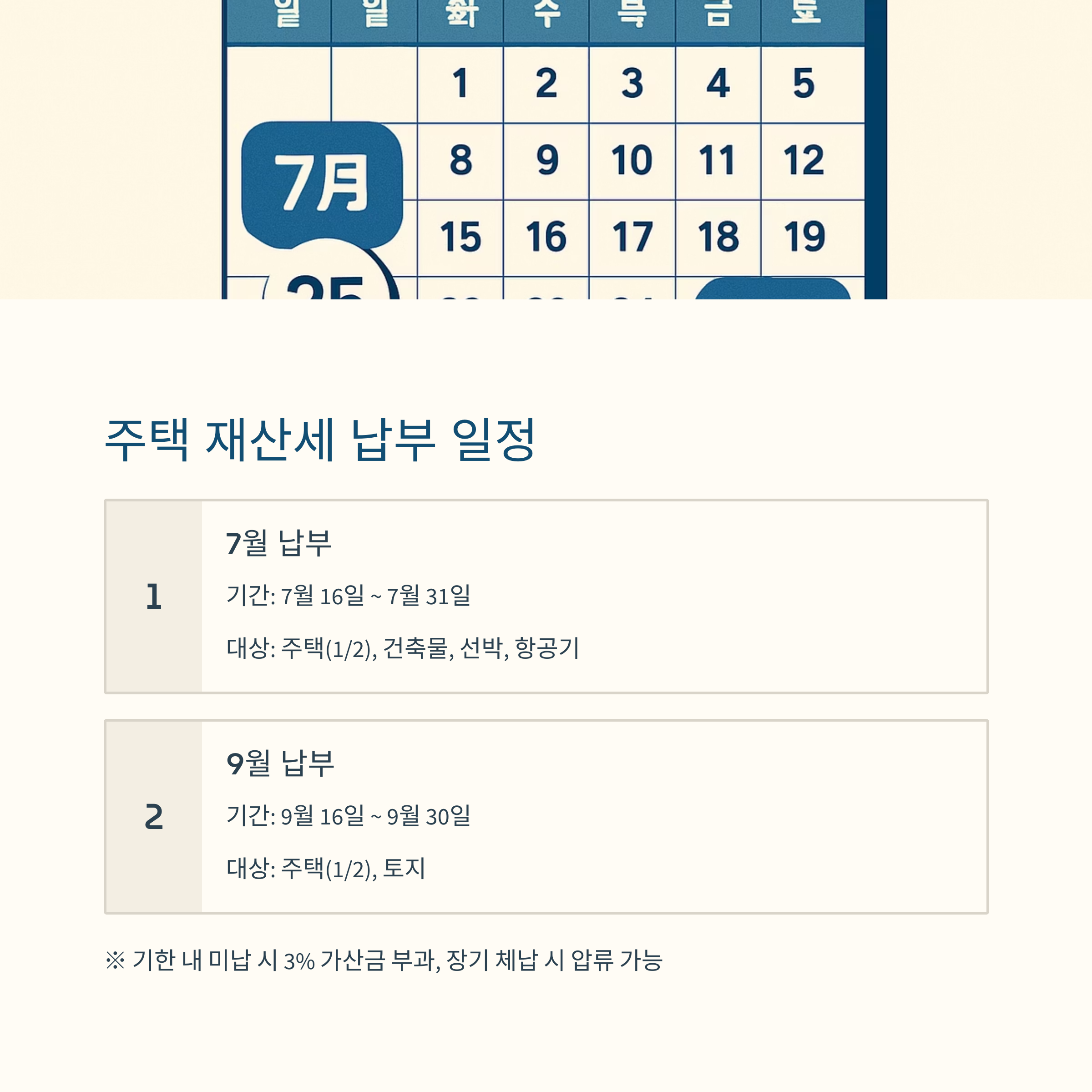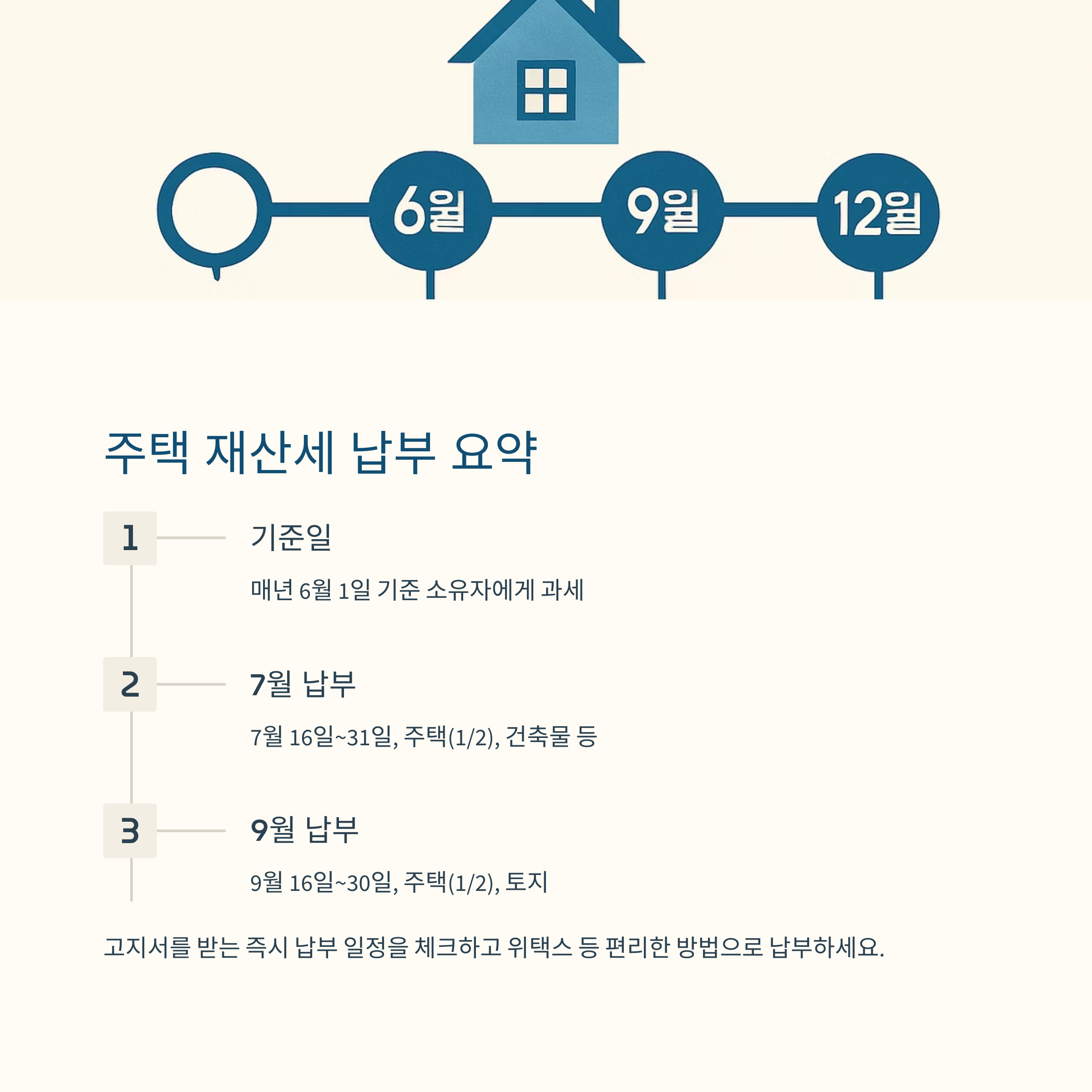 주택 재산세 납부일은 7월과 9월로 정해져 있으며, 기준일은 매년 6월 1일입니다.