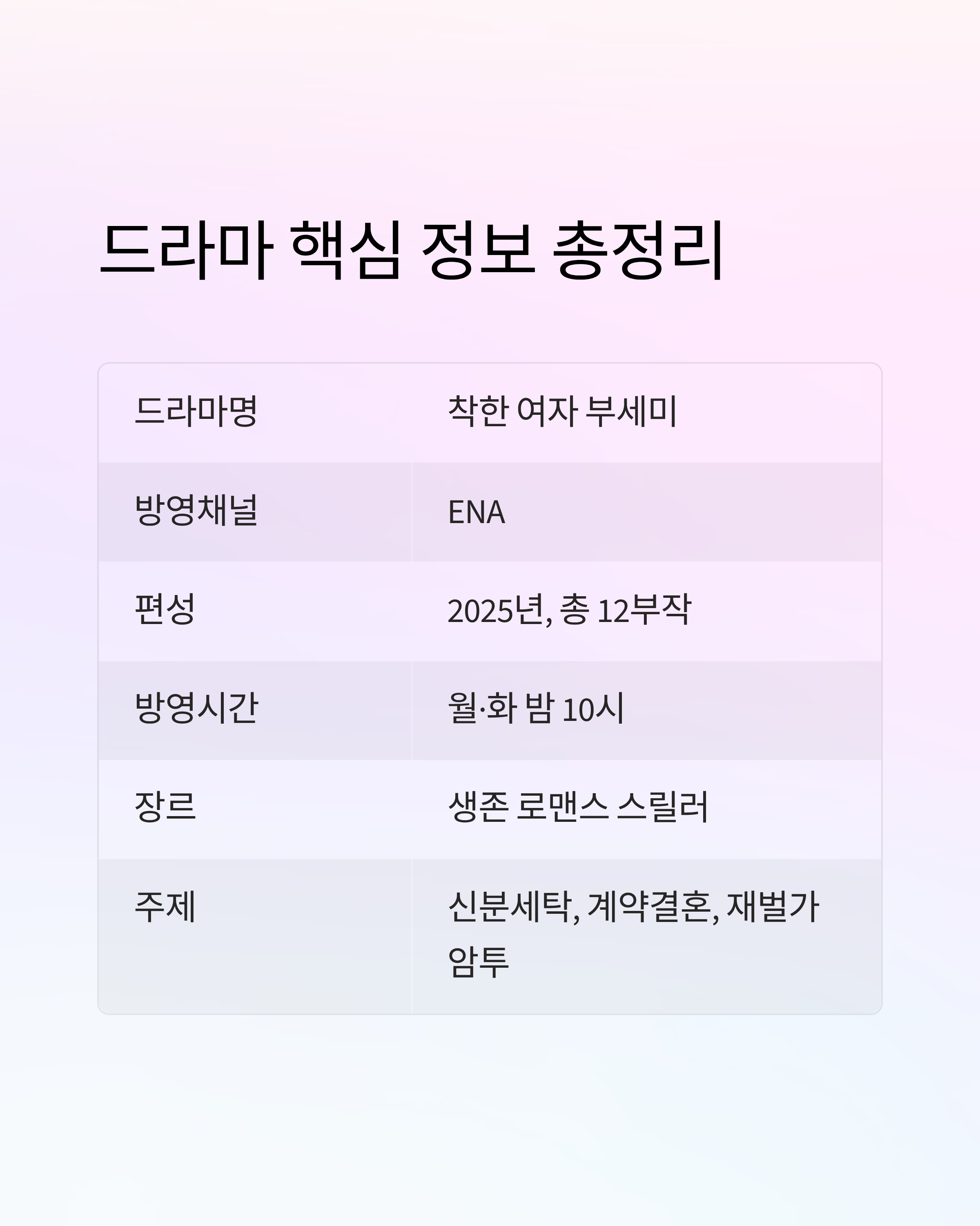 | 편성 정보 | 2025년, 총 12부작, 월·화 밤 10시 |