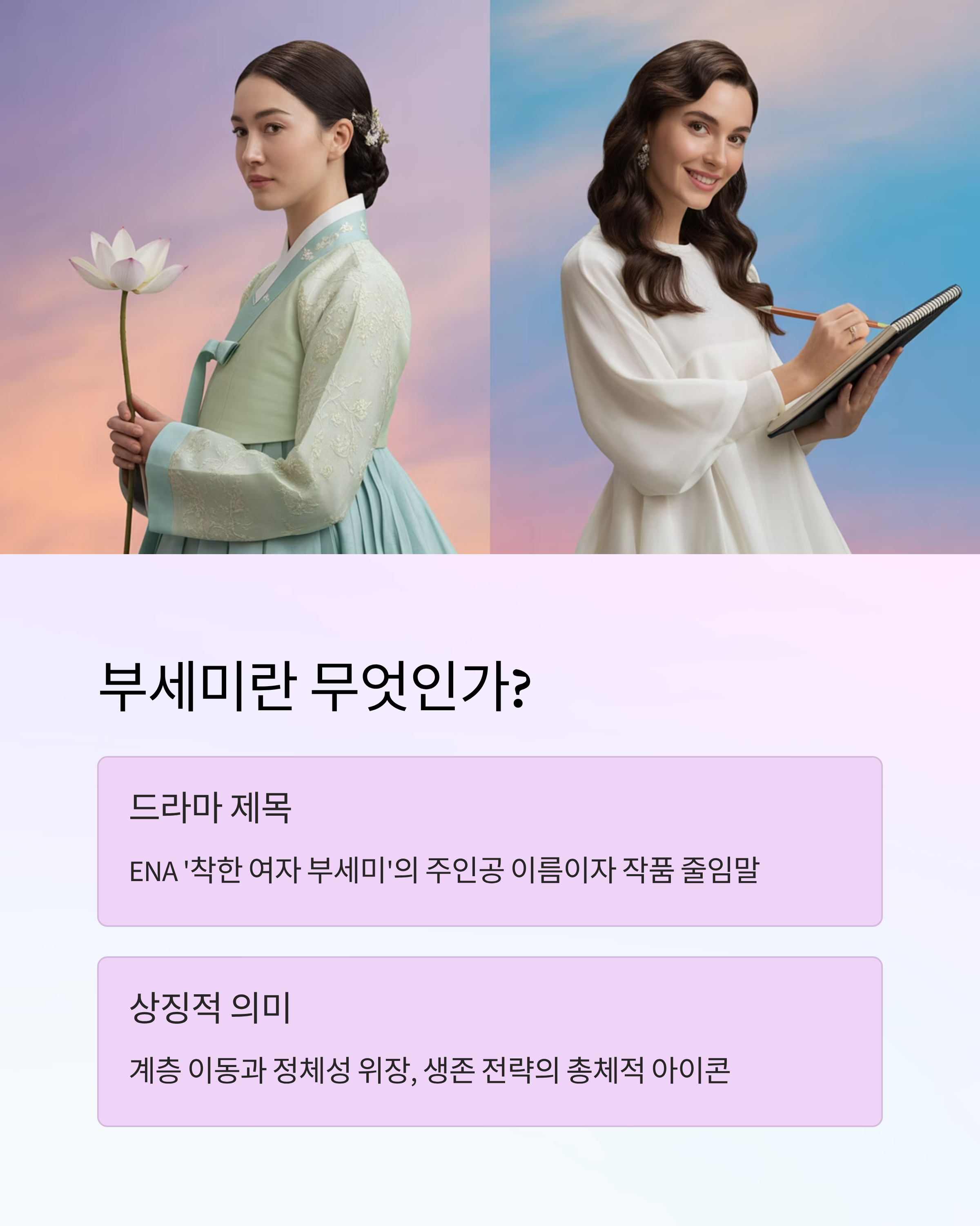 즉, ‘부세미’는 단순한 인물이 아닌, 계층 이동과 정체성 위장, 생존 전략의 총체적 아이콘이라 볼 수 있습니다.