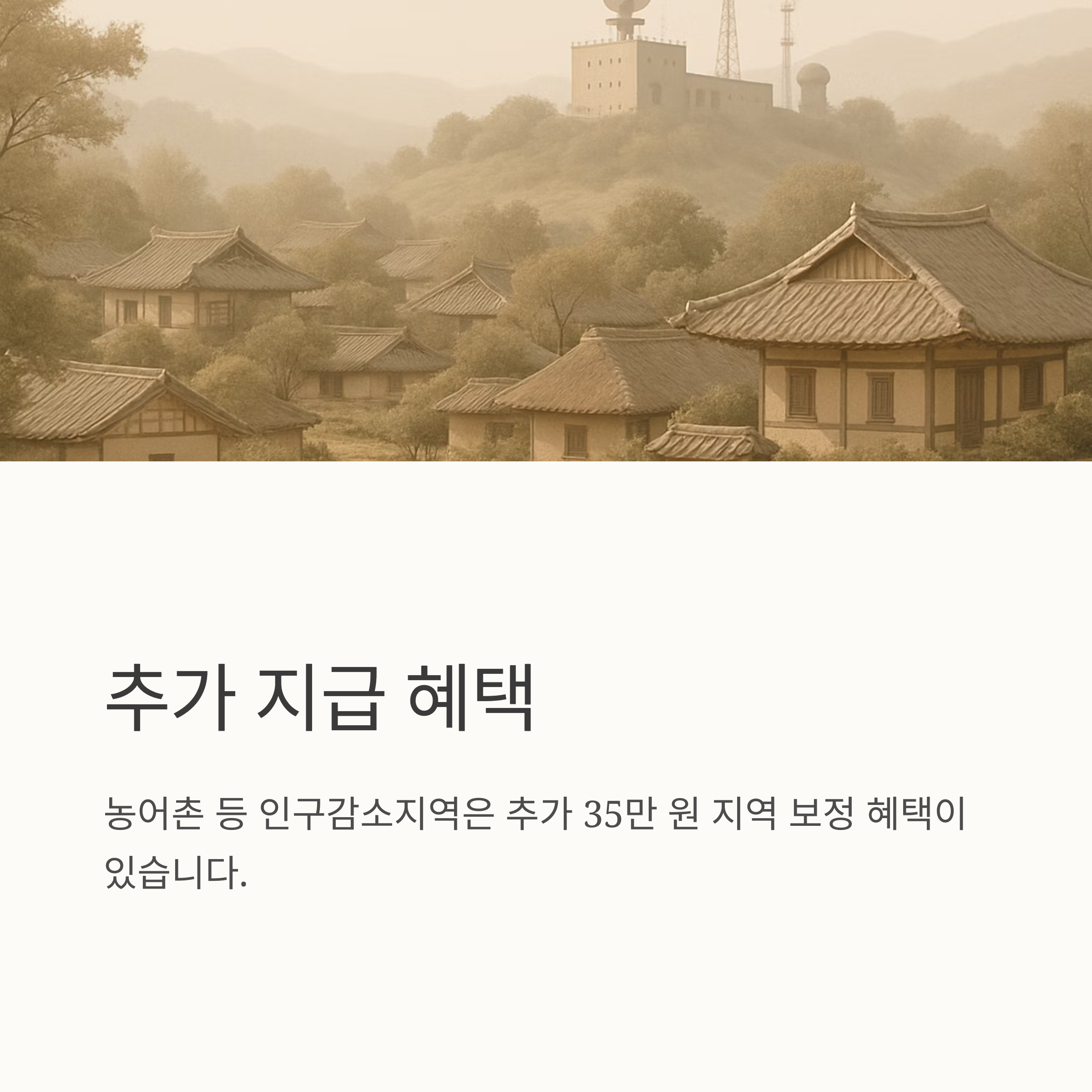 - 지역 보정: 농어촌 등 인구감소지역은 추가 3~5만 원