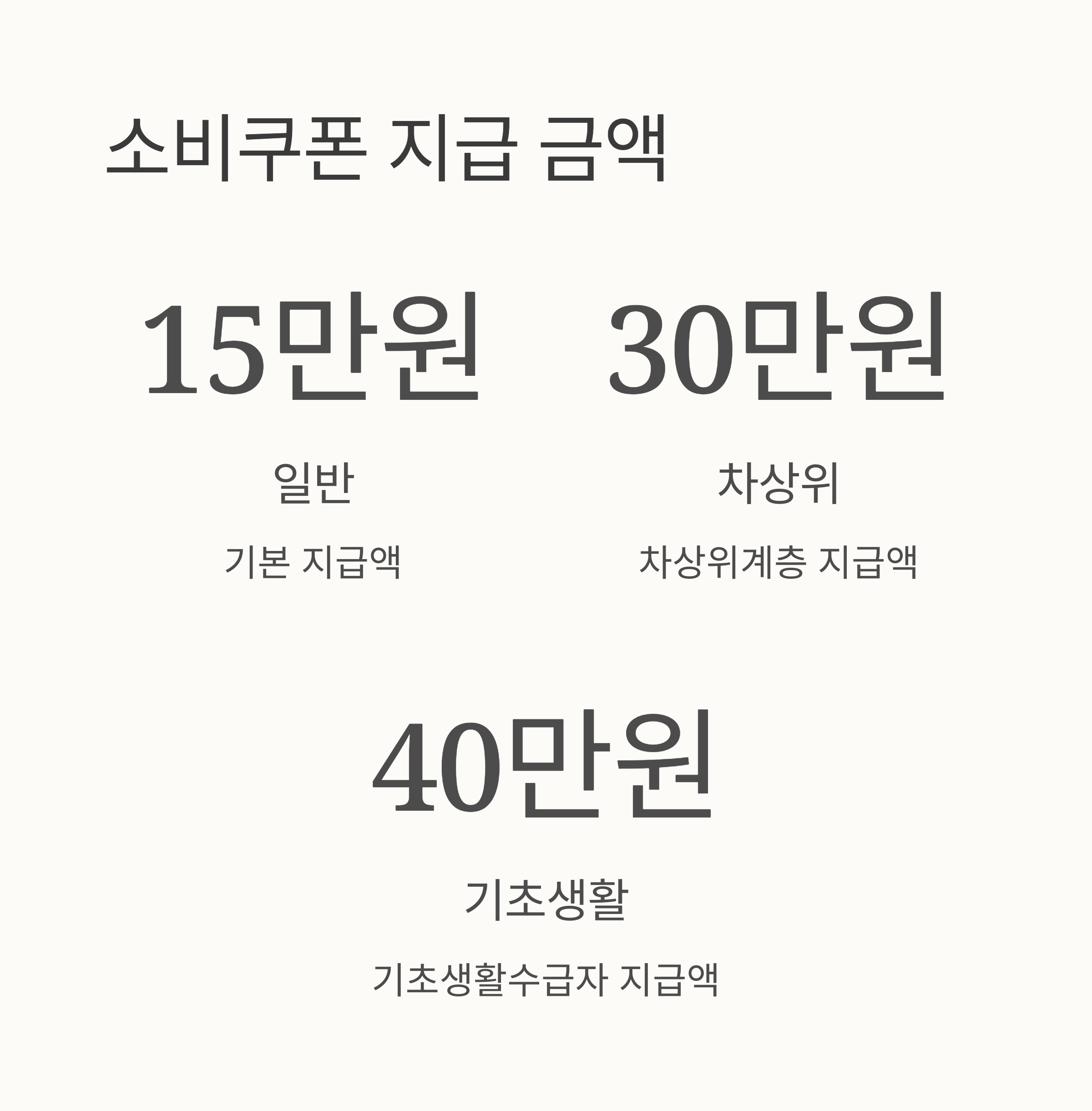 - 1차 지급: 일반 15만 원 / 차상위 30만 원 / 기초생활수급자 40만 원