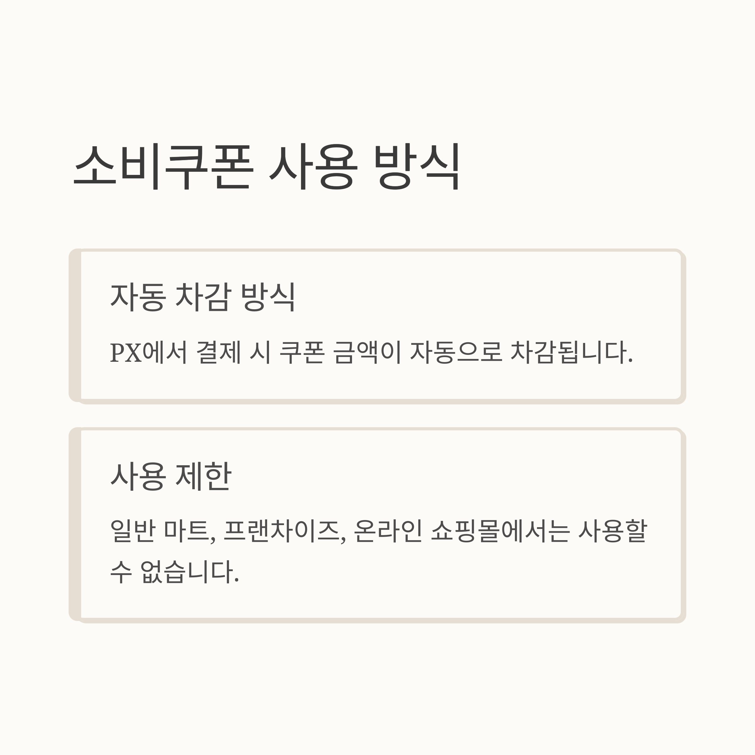 Q2. 민생회복 소비쿠폰 군인 사용처가 PX 외에 없나요?A2. 현재 기준으로는 **군 PX(Post Exchange)**에서만 사용 가능합니다. 보안상의 이유로 일반 상점, 온라인 쇼핑몰 등 외부 유통망에서는 사용이 제한됩니다. 다만, PX 내에는 다양한 생필품과 식품이 구비되어 있어 실질적인 소비 혜택은 충분히 누릴 수 있습니다.
