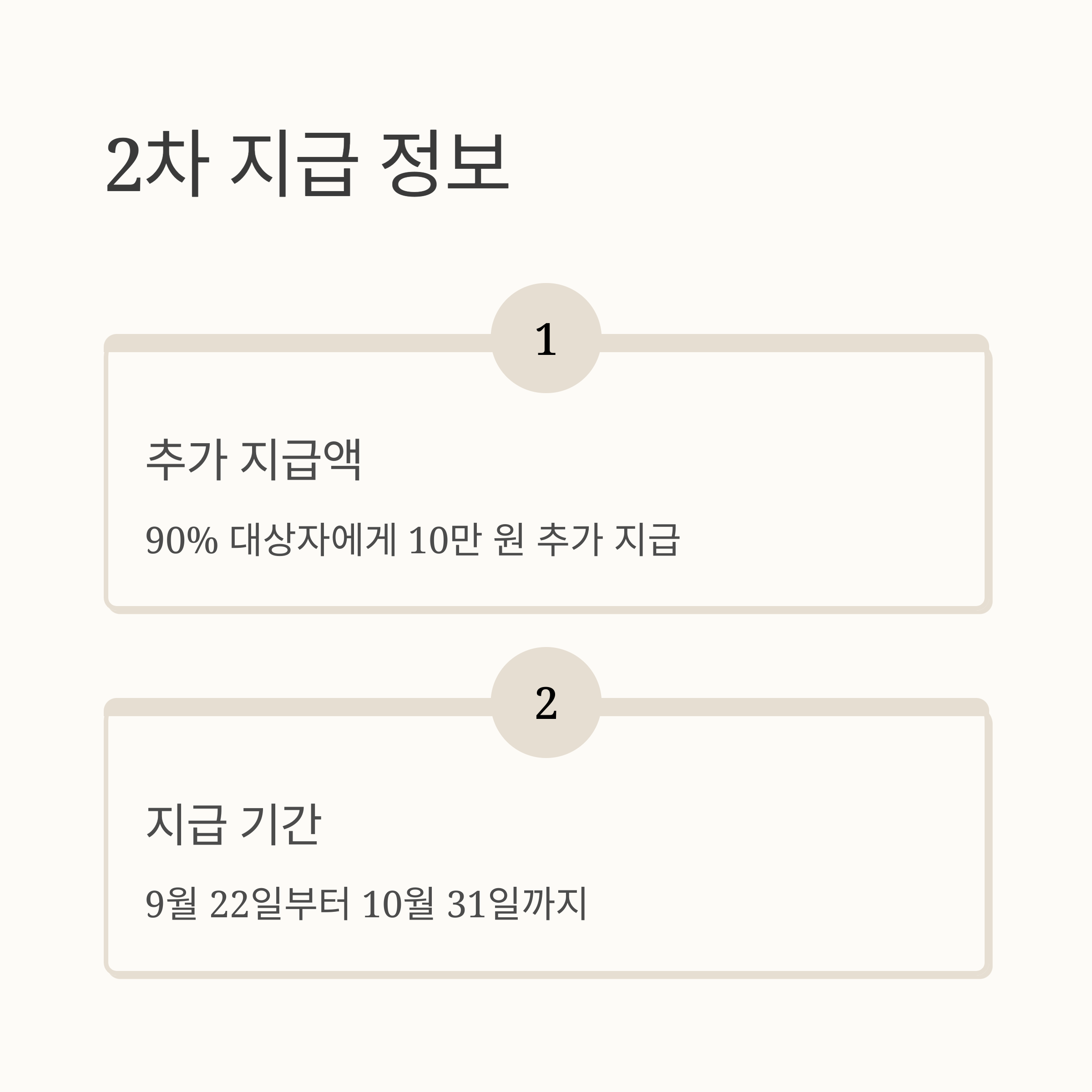 - 2차 지급: 90% 대상자에 10만 원 추가(9월 22일~10월 31일)