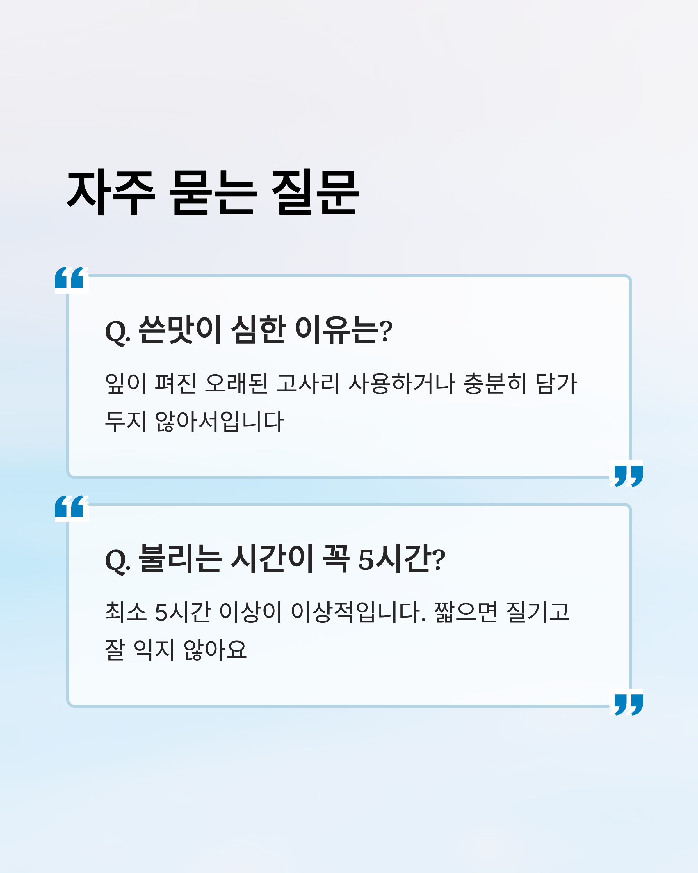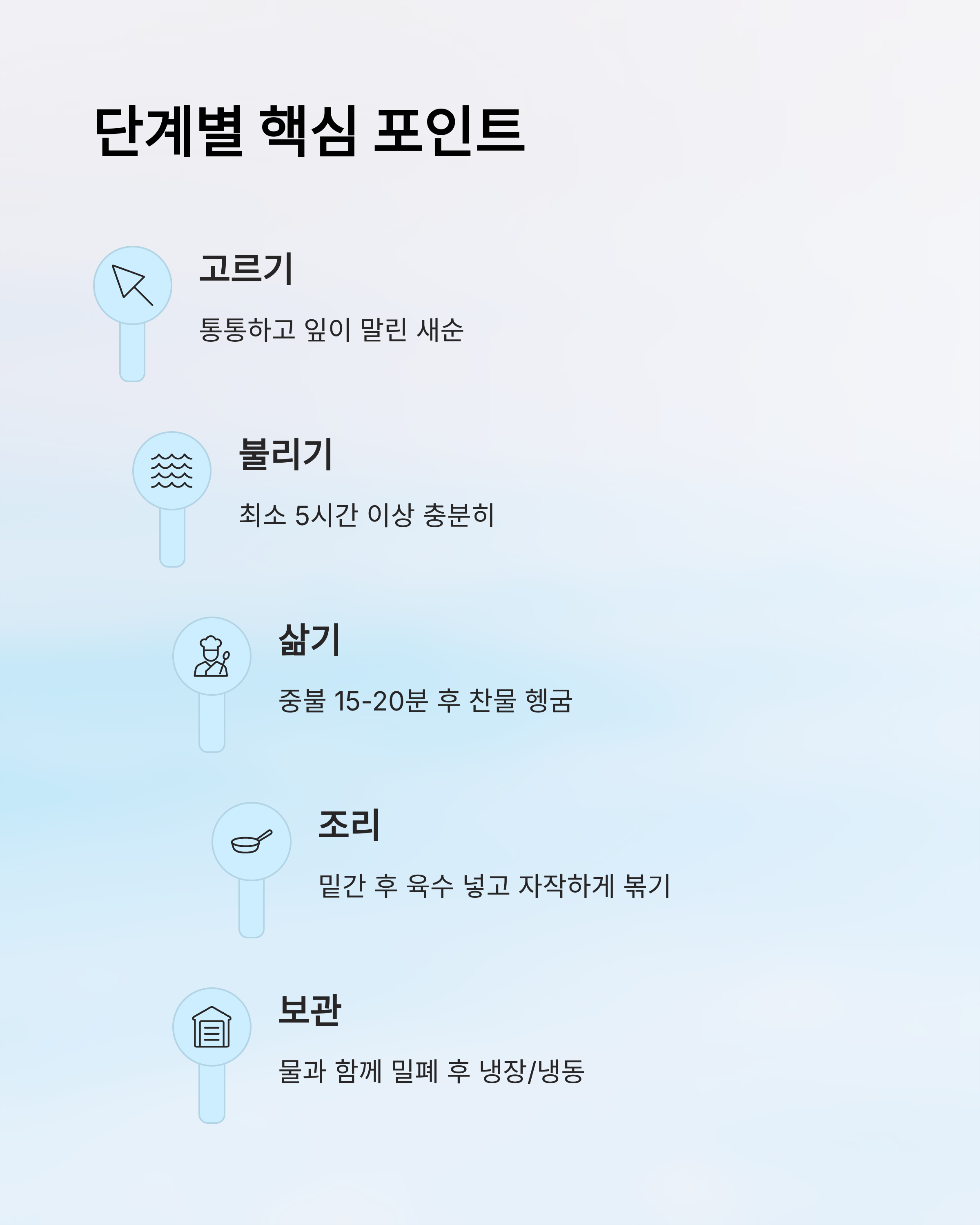 - 헹구기 & 담가두기: 삶은 후 찬물에 3회 헹군 뒤, 찬물에 20분간 담가 쓴맛 제거.
