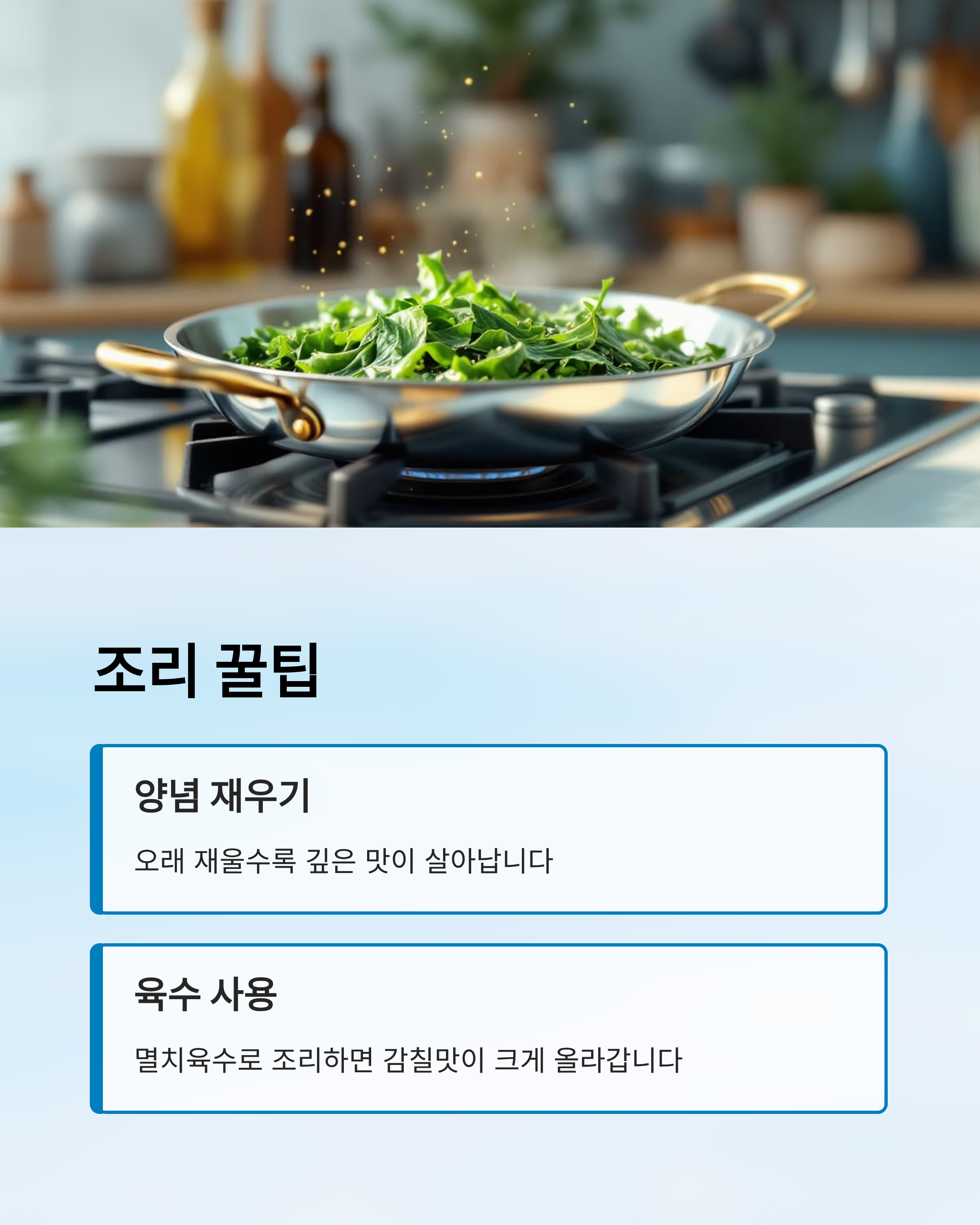 - 뜸 들이기: 물기 있는 상태로 20분~1시간 두면 수분이 줄기에 스며들어 더 부드럽습니다.