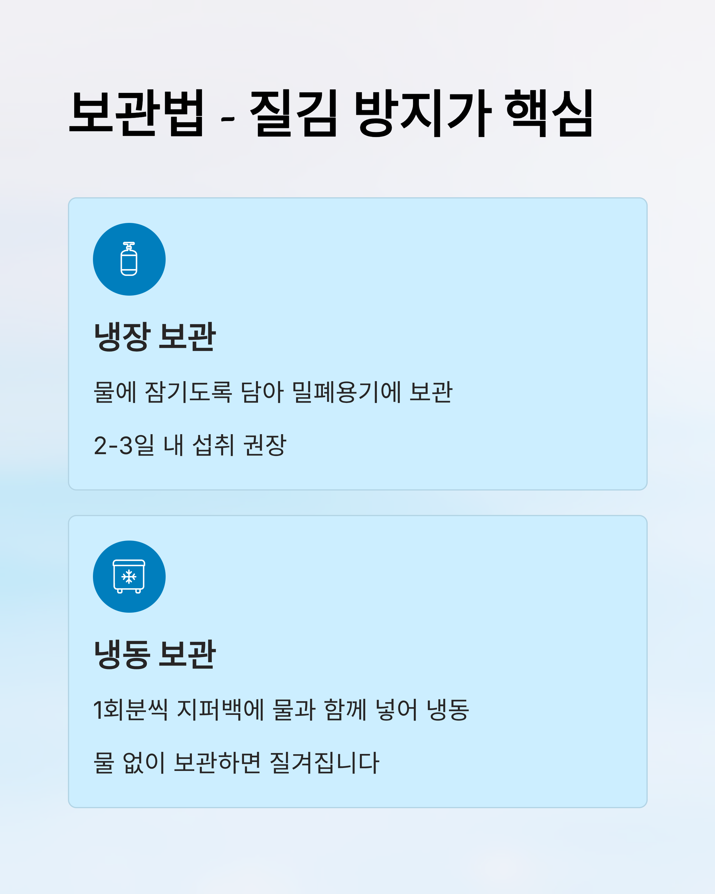 | 보관 | 물과 함께 밀폐 후 냉장/냉동 |