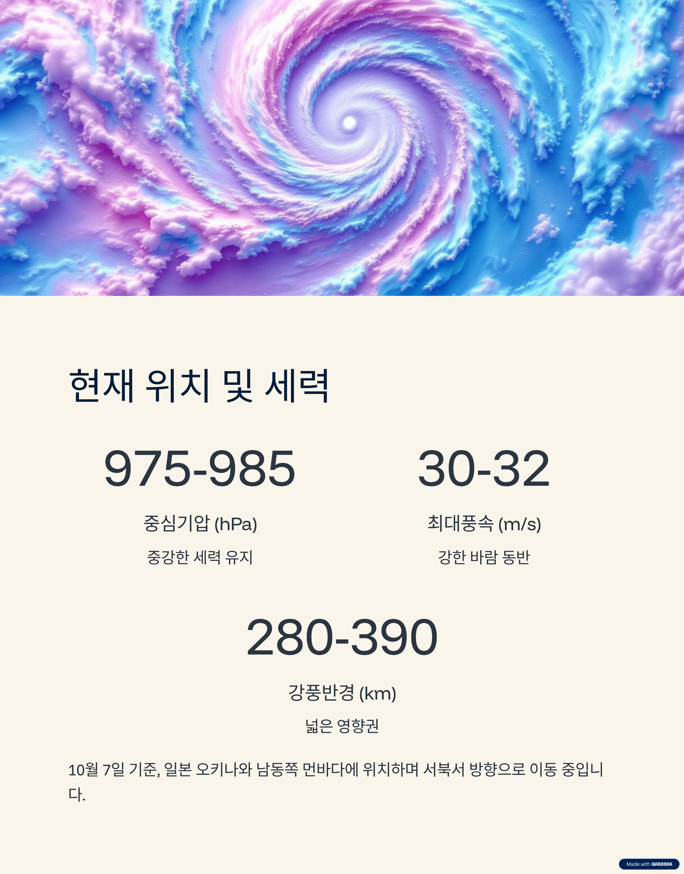 - 2025년의 제22호 태풍으로, 중강도의 세력을 유지하면서도 예측 경로 내 강한 영향력을 보이는 전형적인 가을 태풍 특징을 보여주고 있습니다.