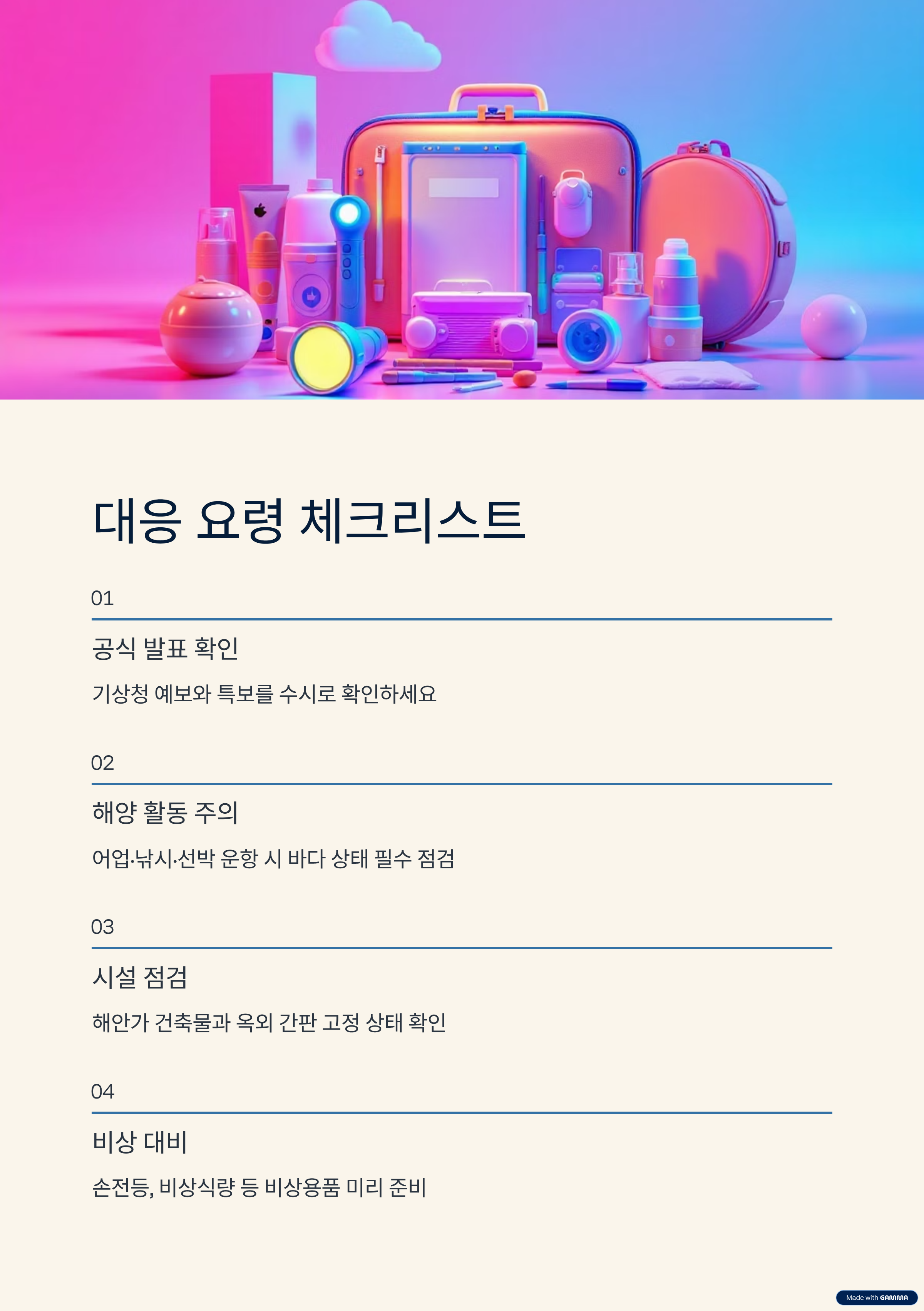 해양 활동(어업, 낚시, 선박 운항 등)을 계획 중이라면 바다 상태와 너울 경고를 반드시 확인해야 합니다. - 건물 및 시설 점검