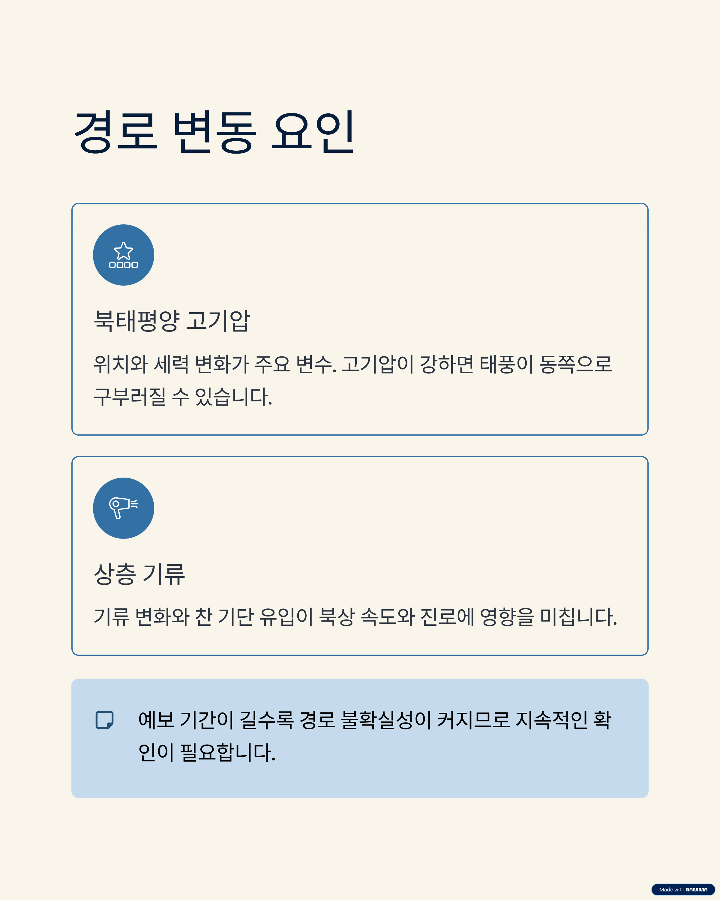 - 상층 기류 변화나 찬 기단 유입도 태풍의 북상 속도나 진로 변동에 영향을 줄 수 있습니다.