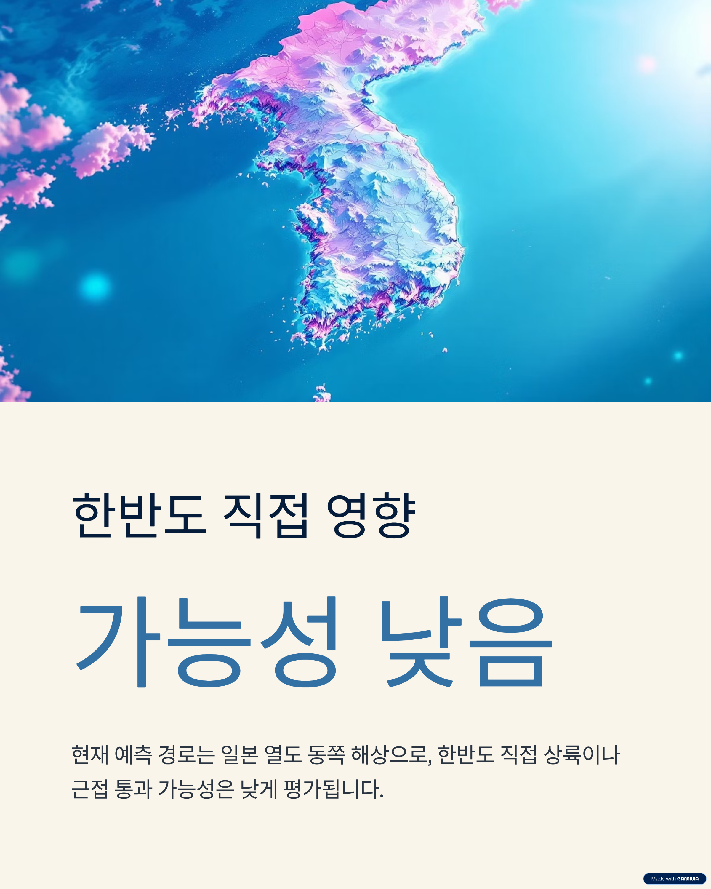 | 한반도 영향 | 직접 영향 가능성 낮음, 간접 영향(너울성 파도, 강풍) 가능성 있음 |