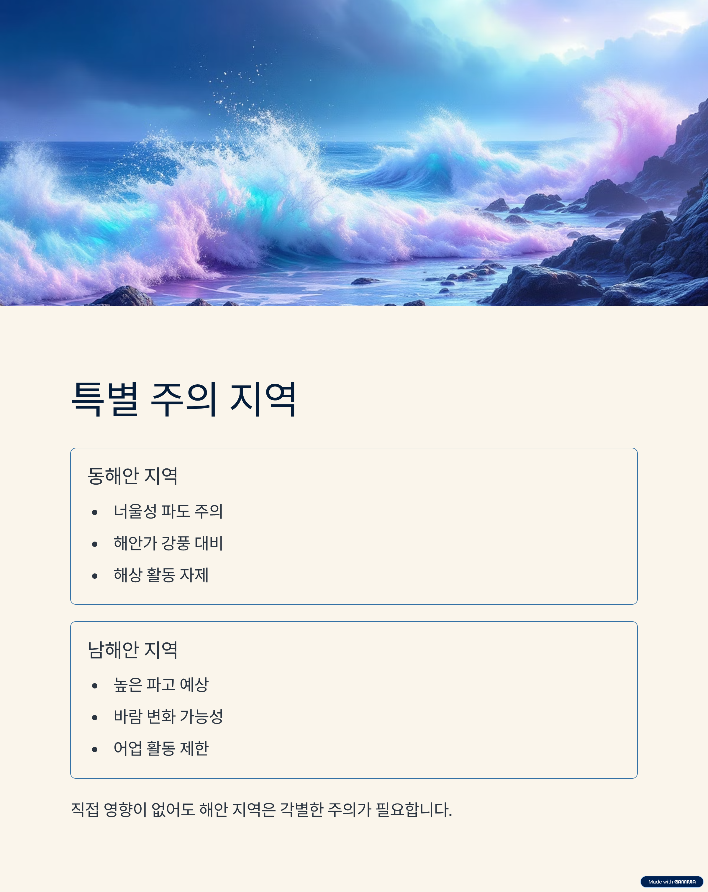 동해안 및 남해안 지역은 직접 영향을 받지 않더라도 너울성 파도·바람 변화 가능성이 크니 특히 주의해야 합니다.