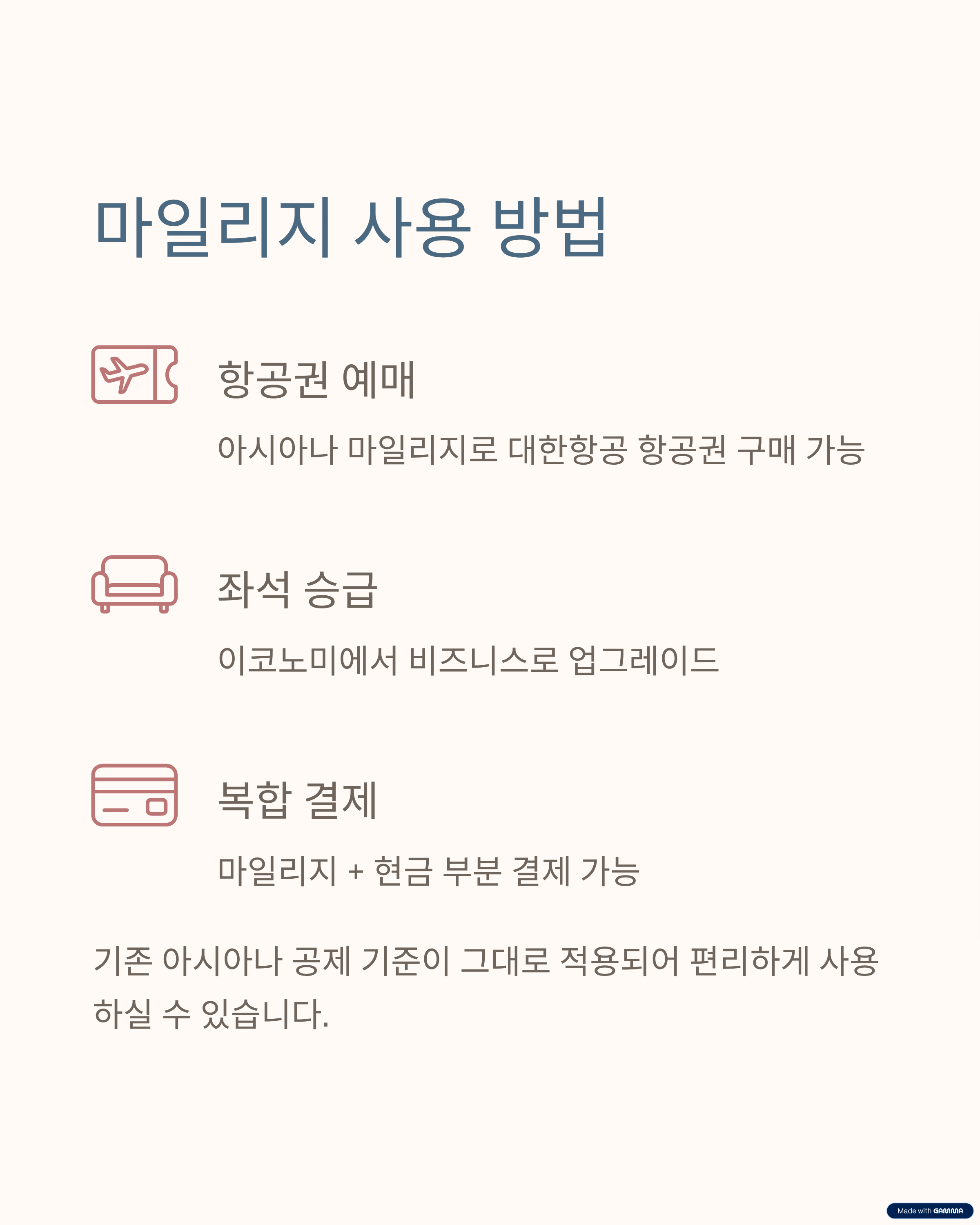 → 항공권 예매, 좌석 승급, 보너스 항공권 등 기존 아시아나 공제 기준 적용 - 복합 결제(마일리지 + 현금) 가능