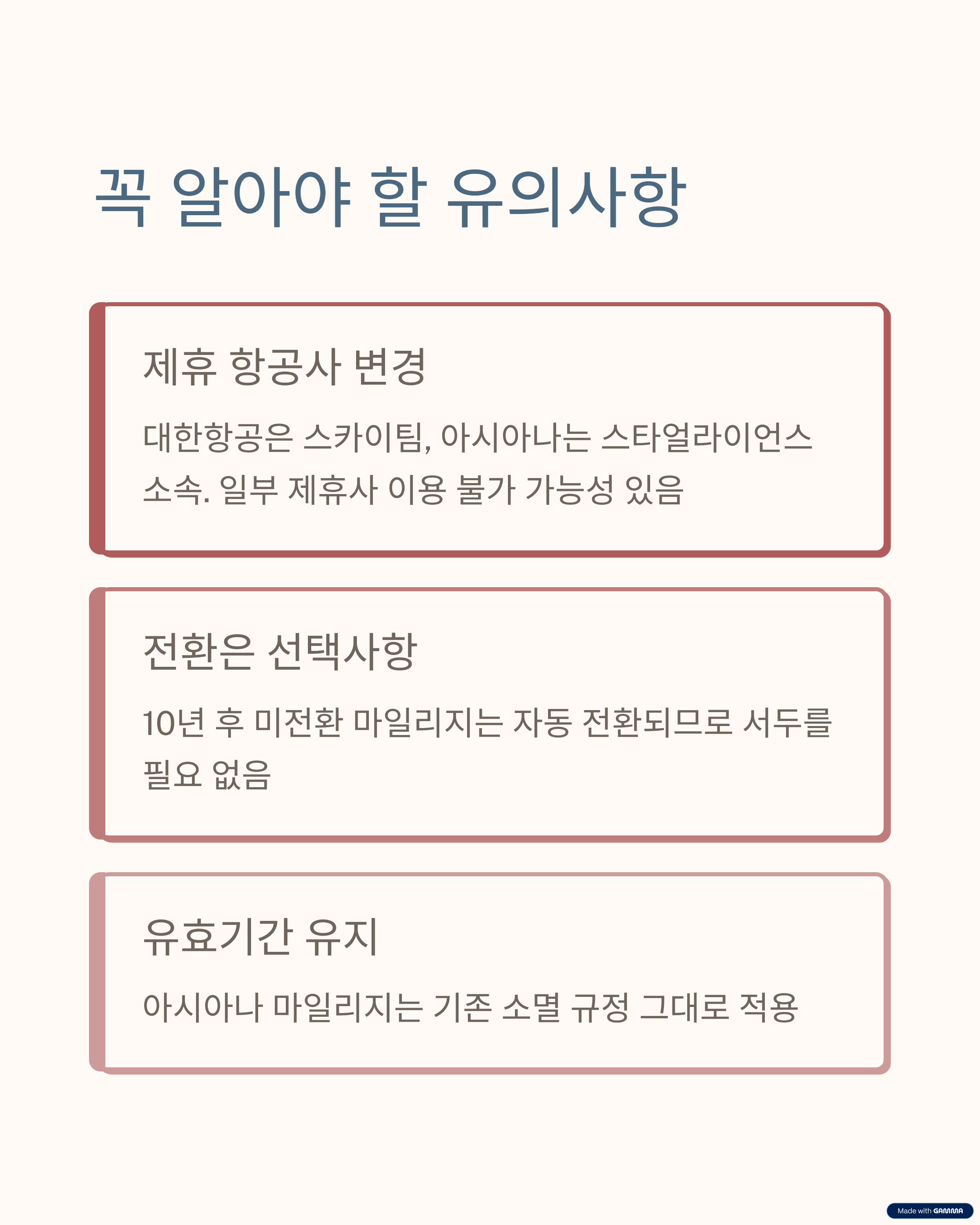 - 10년 후 미전환 마일리지는 자동 전환되므로 급할 필요 없음