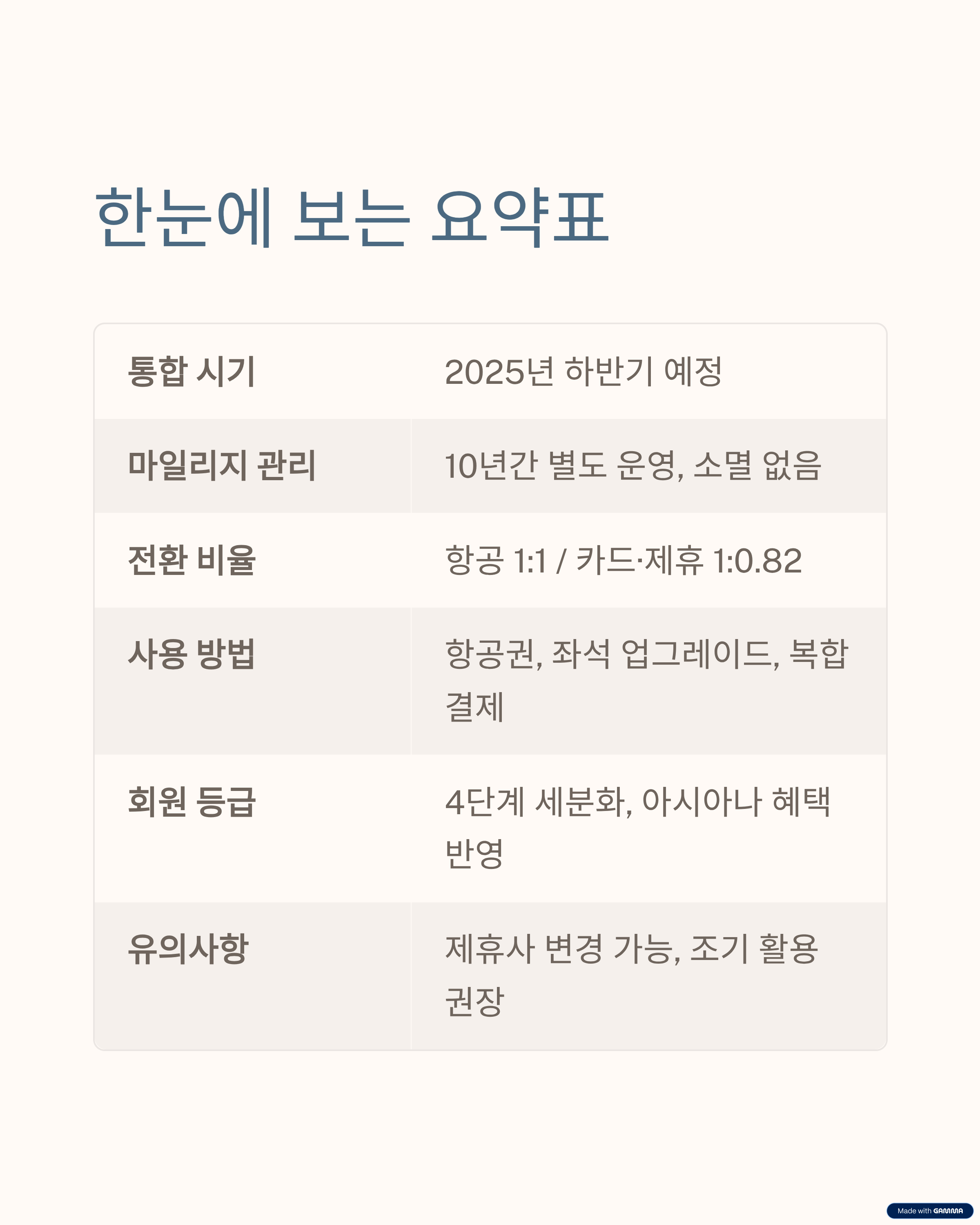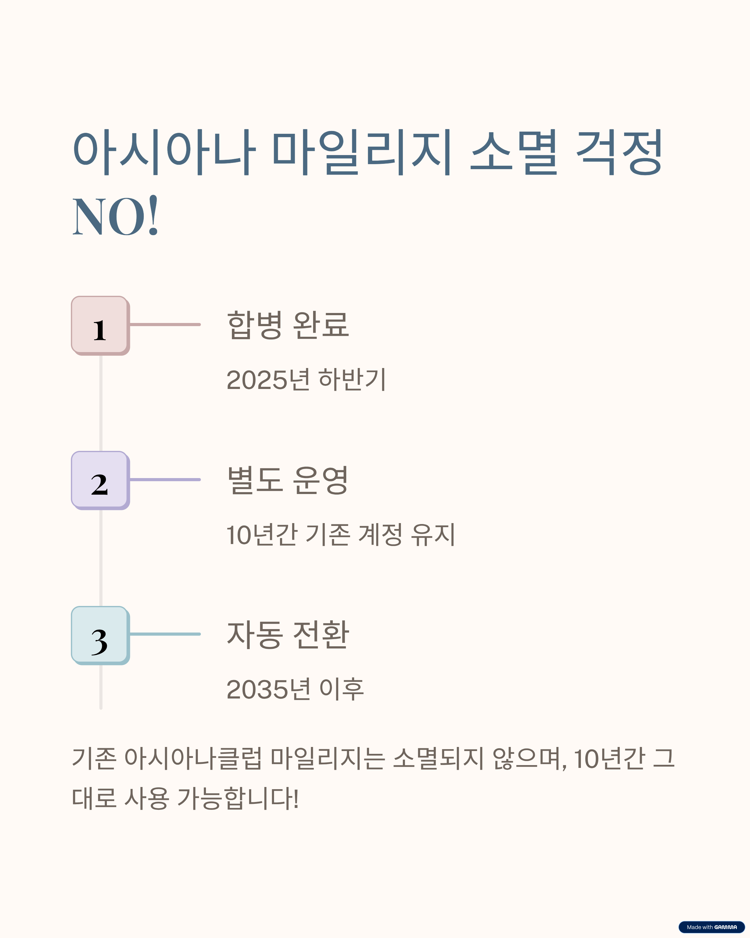 | 아시아나 마일리지 관리 | 10년간 별도 운영, 소멸 없음 |