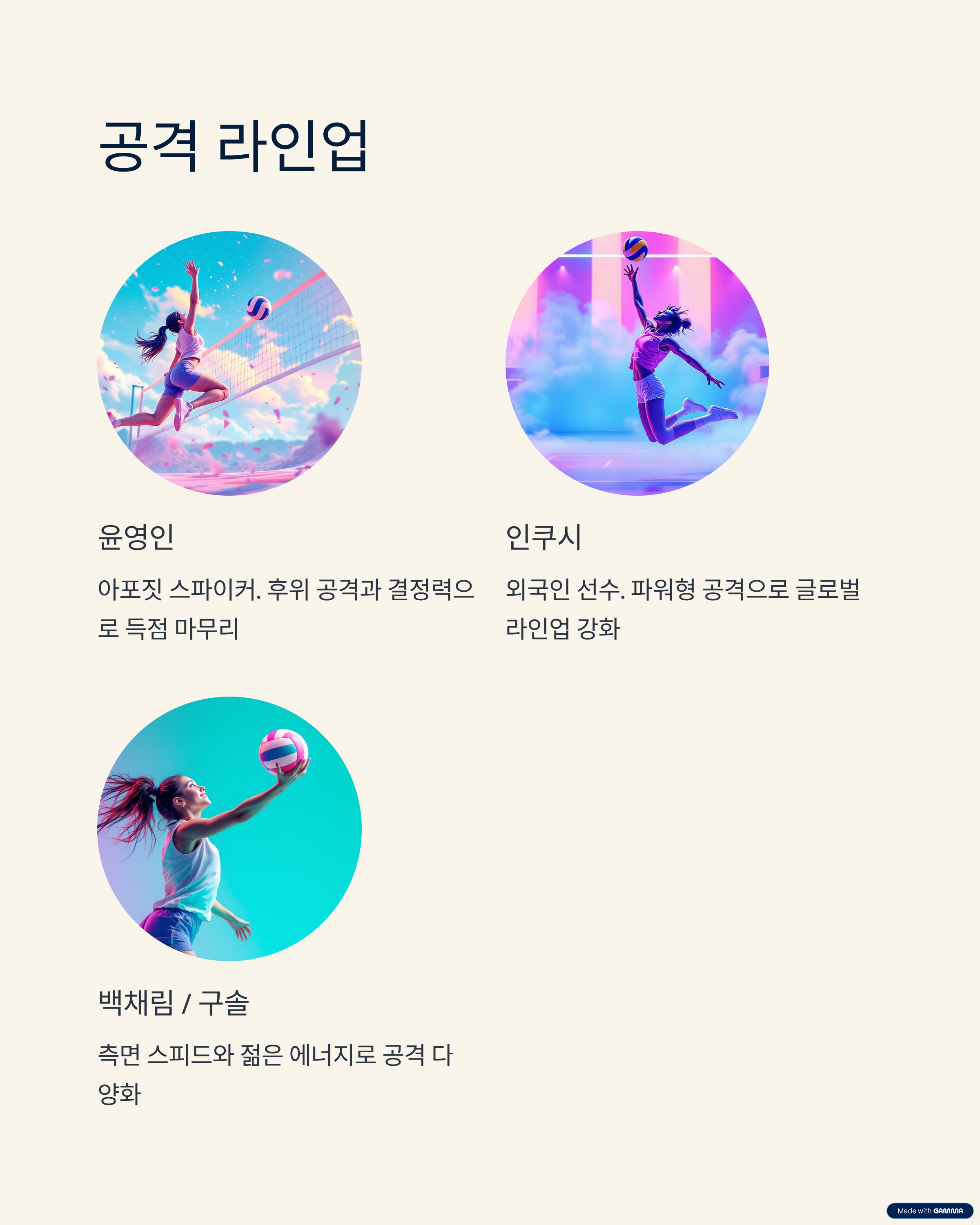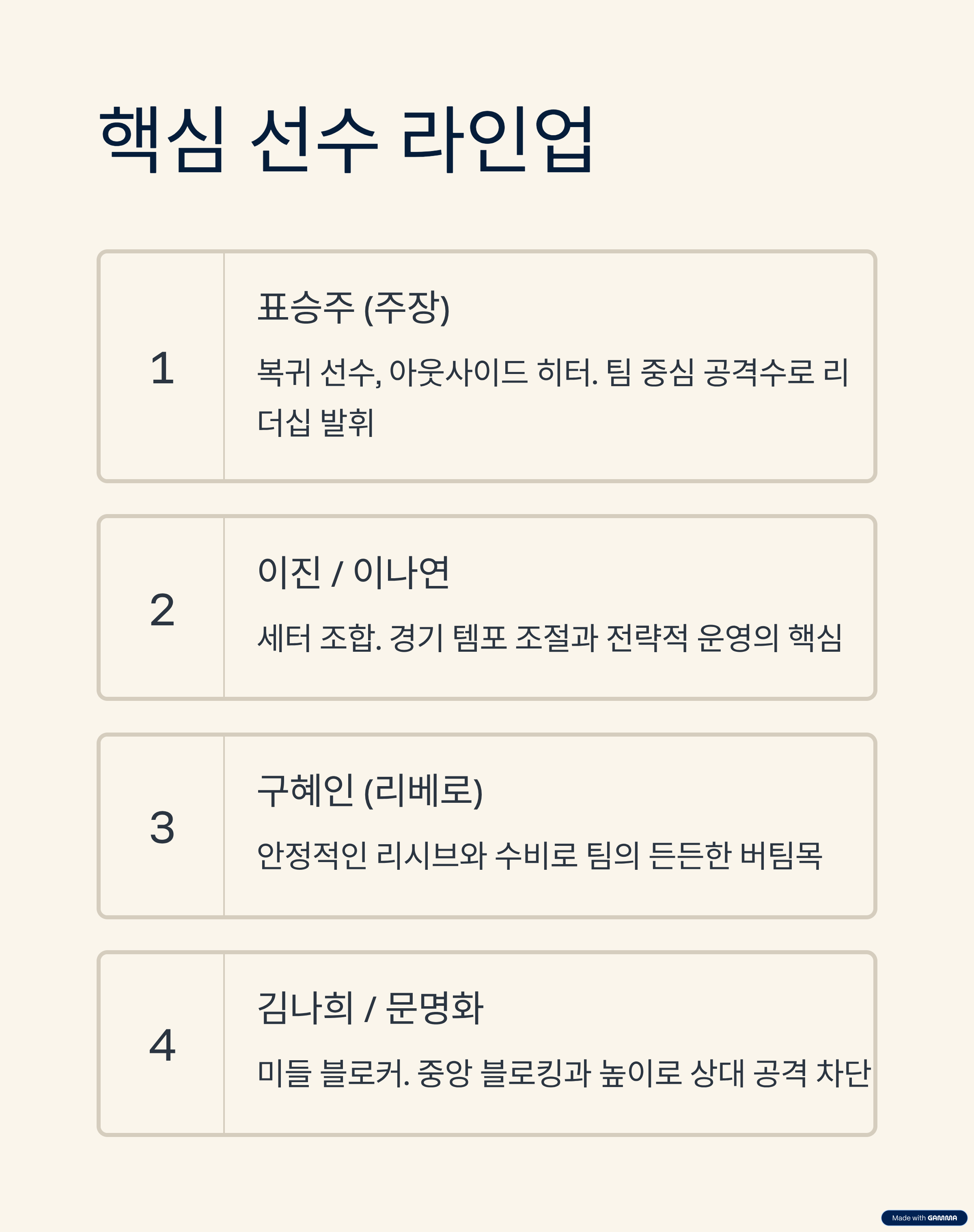 | 미들 블로커 | 김나희 / 문명화 | 중앙 블로킹 핵심, 높이 강화 |