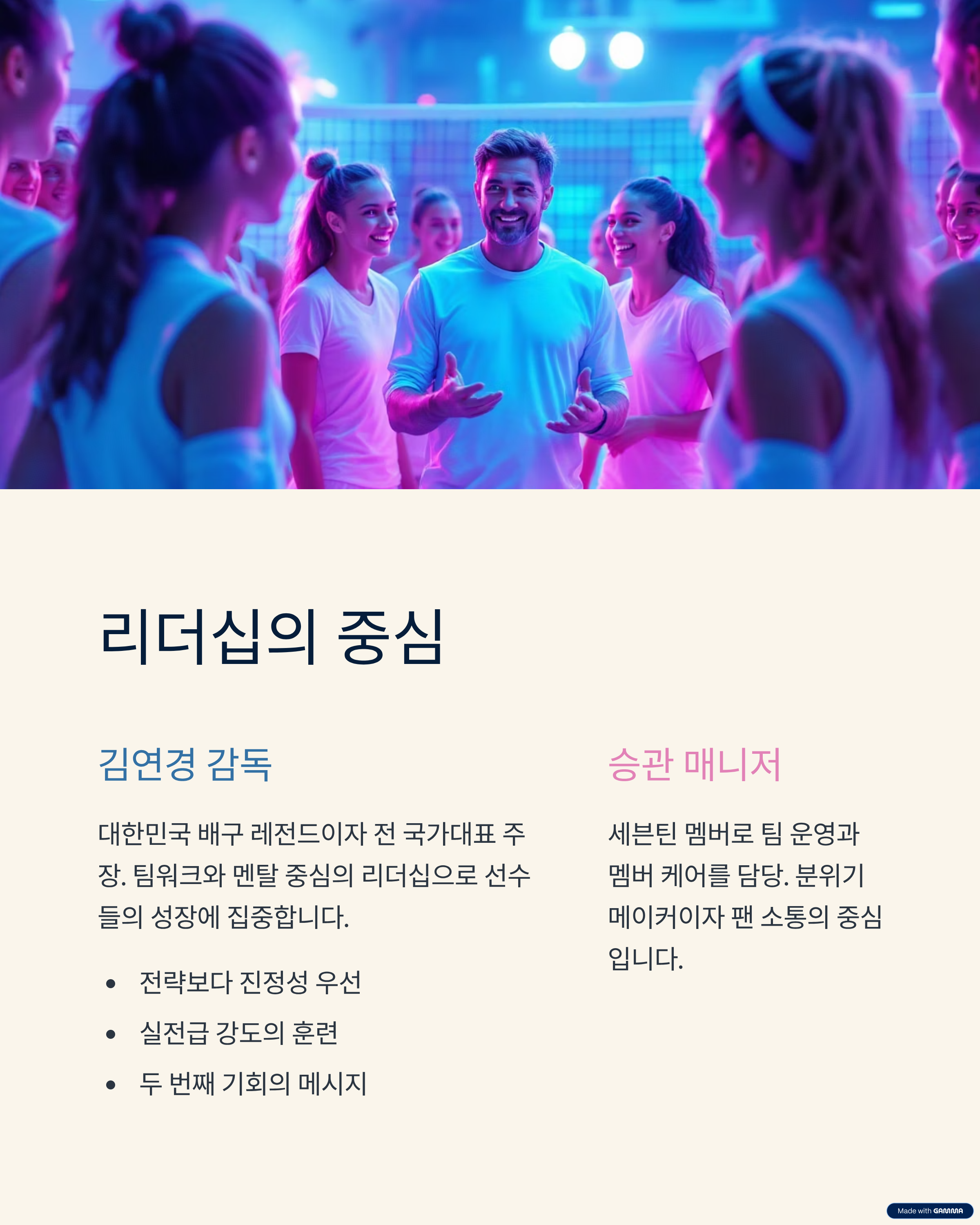 - 감독: 김연경 (대한민국 배구 레전드, 팀 지휘 및 작전 총괄)