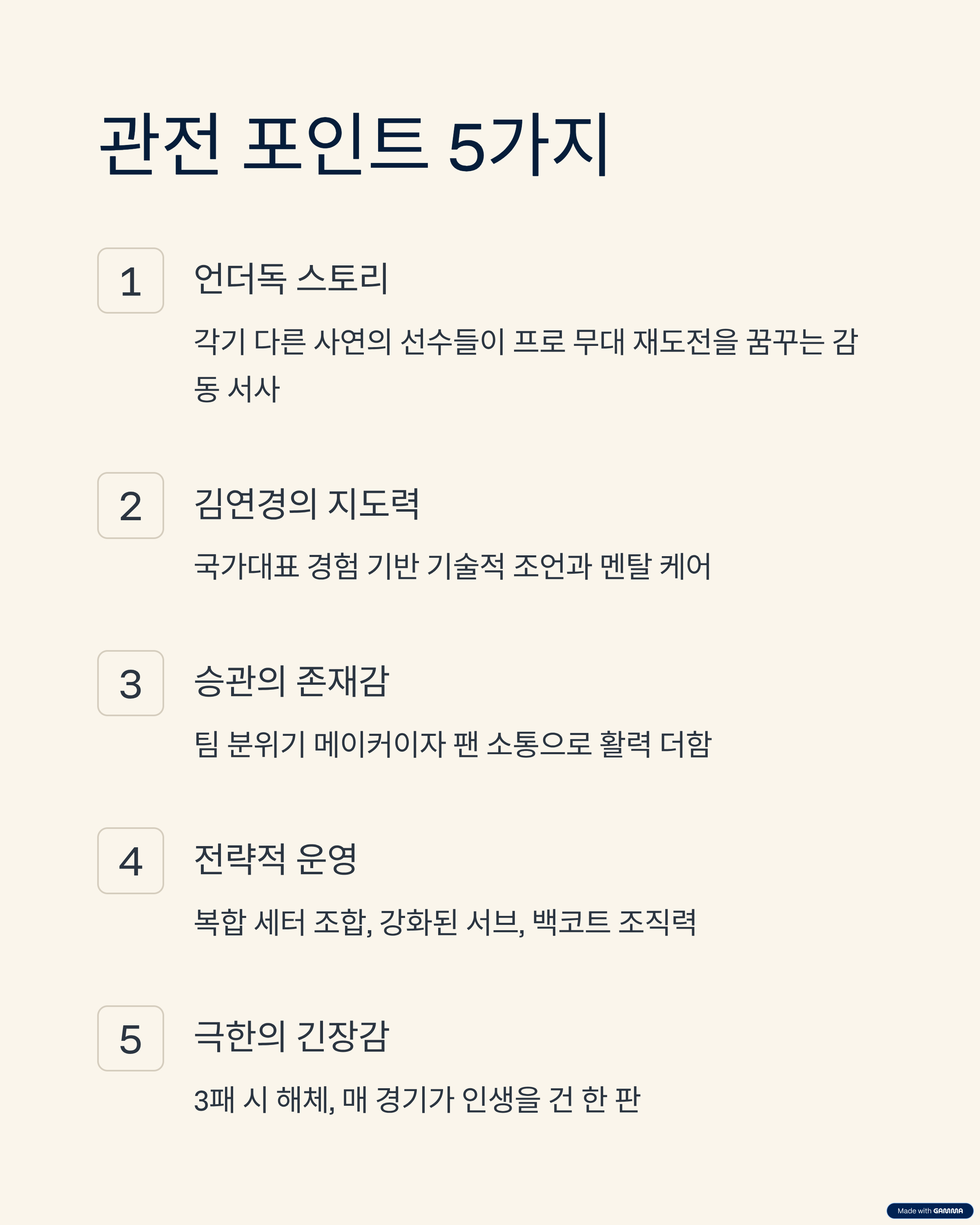 전략보다 ‘팀워크와 멘탈’ 중심의 리더십을 보여주고 있습니다.
