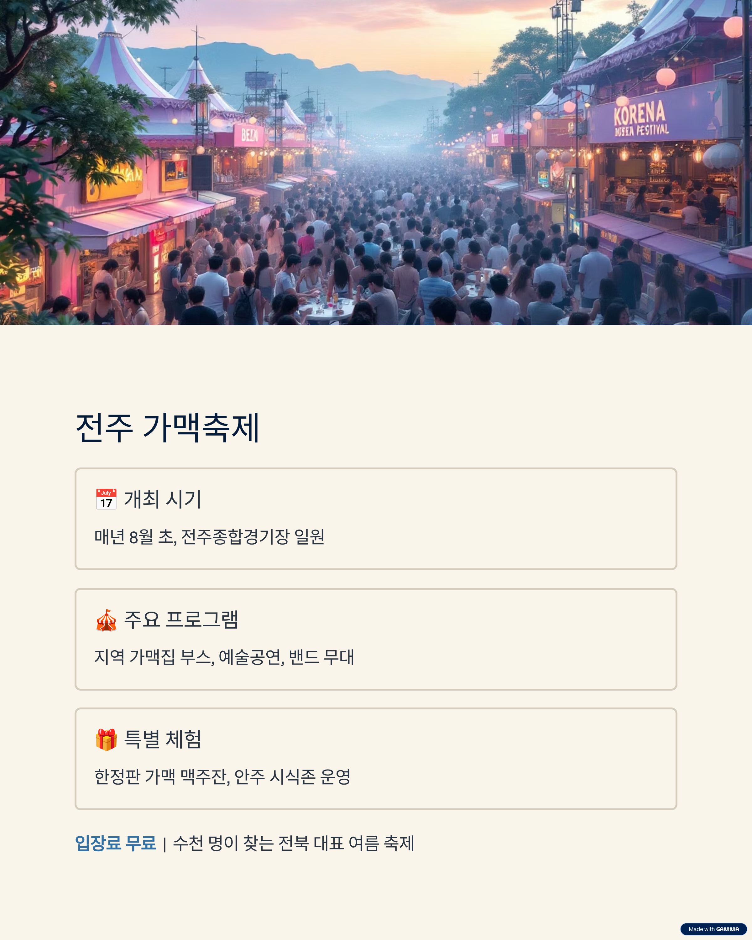 | 대표 축제 | 전주 가맥축제 (매년 8월) |