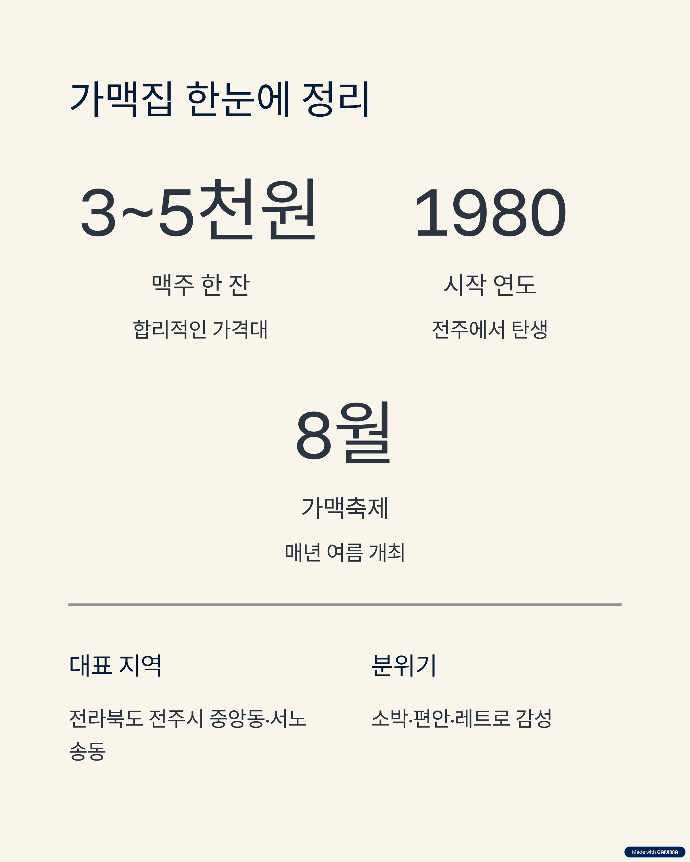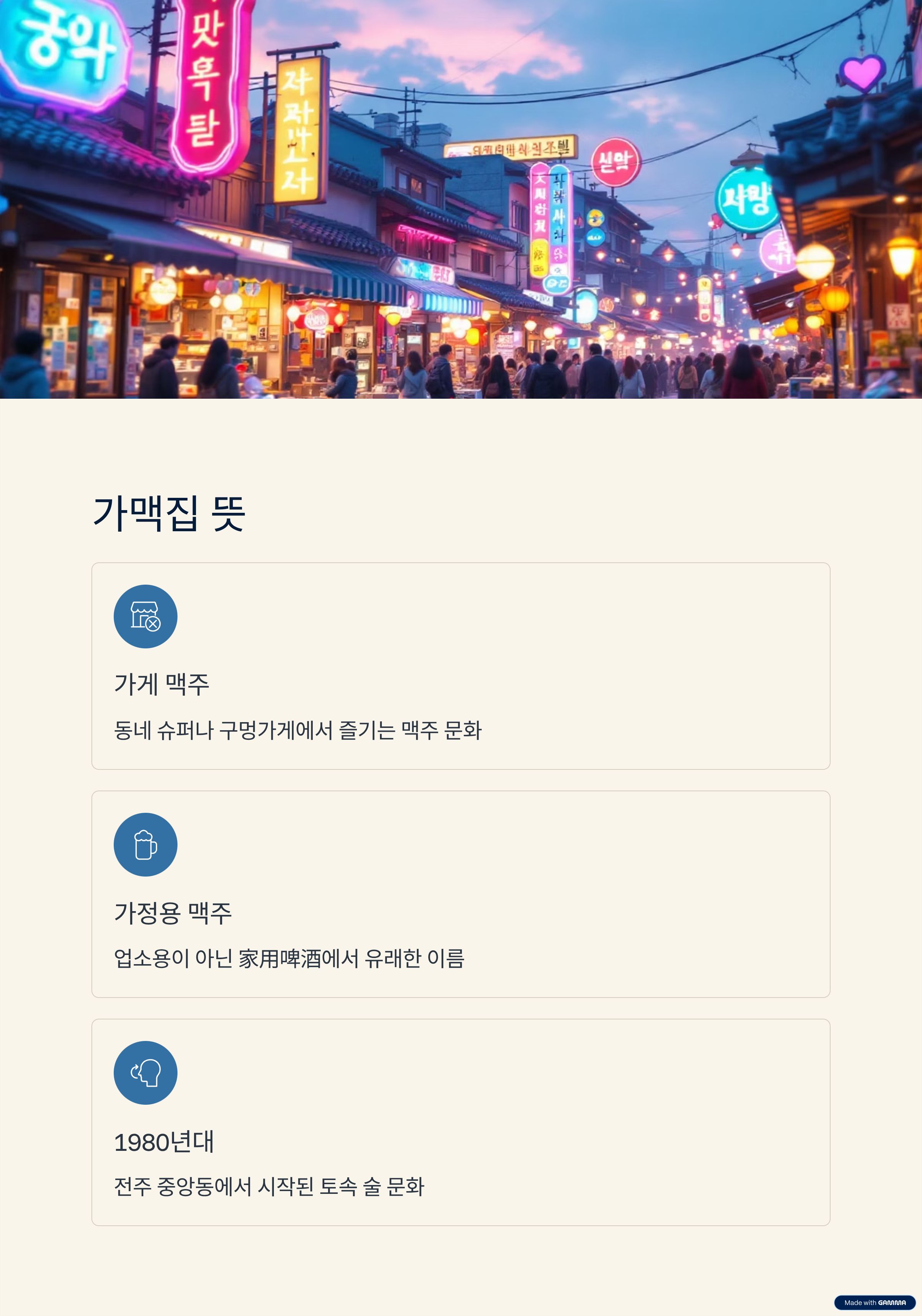 | 가맥집 뜻 | ‘가게 맥주’의 줄임말, 동네 슈퍼형 술집 |