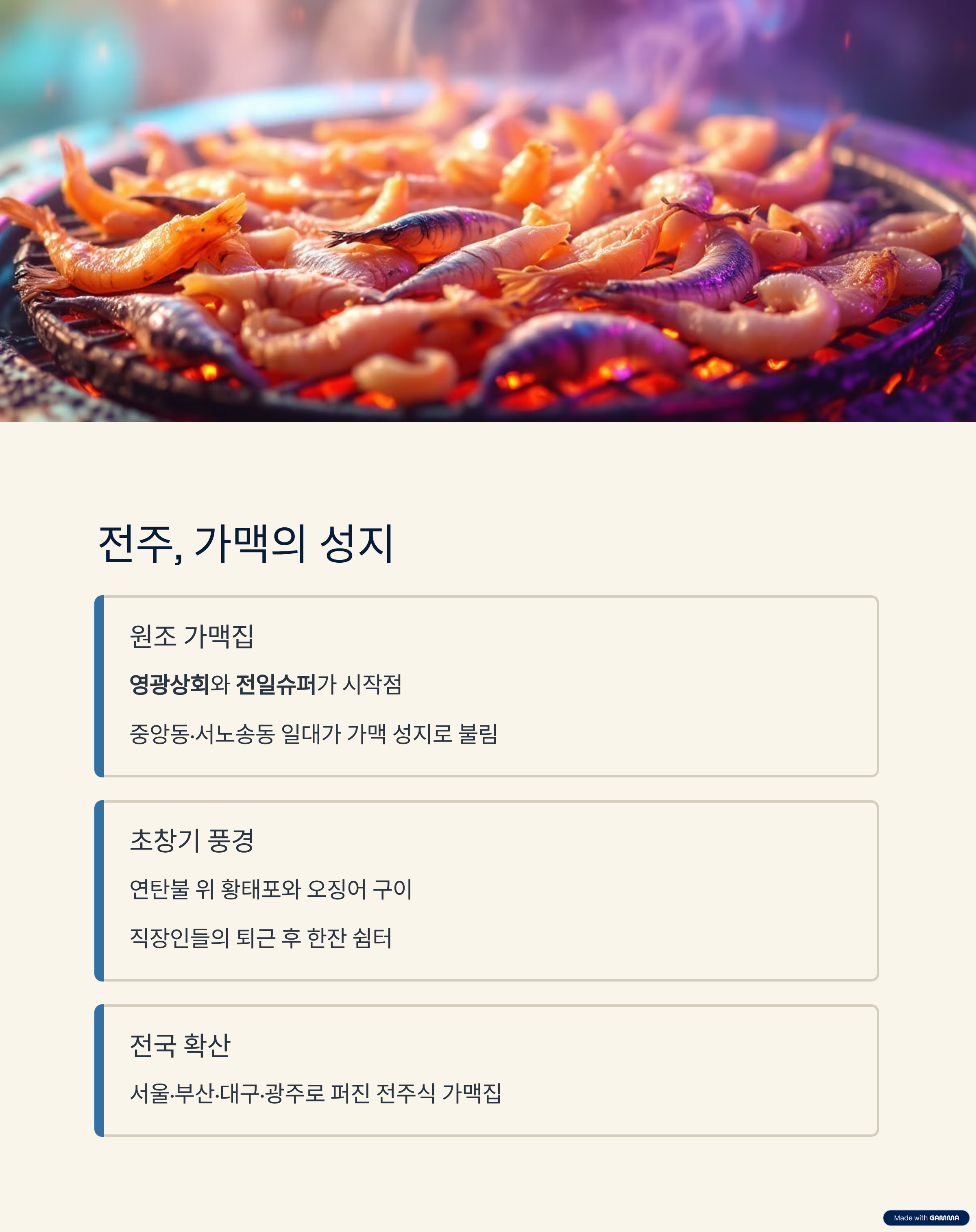 | 2 | 갑오징어 구이 | 고소하고 쫄깃한 식감, 전주 가맥의 상징 |
