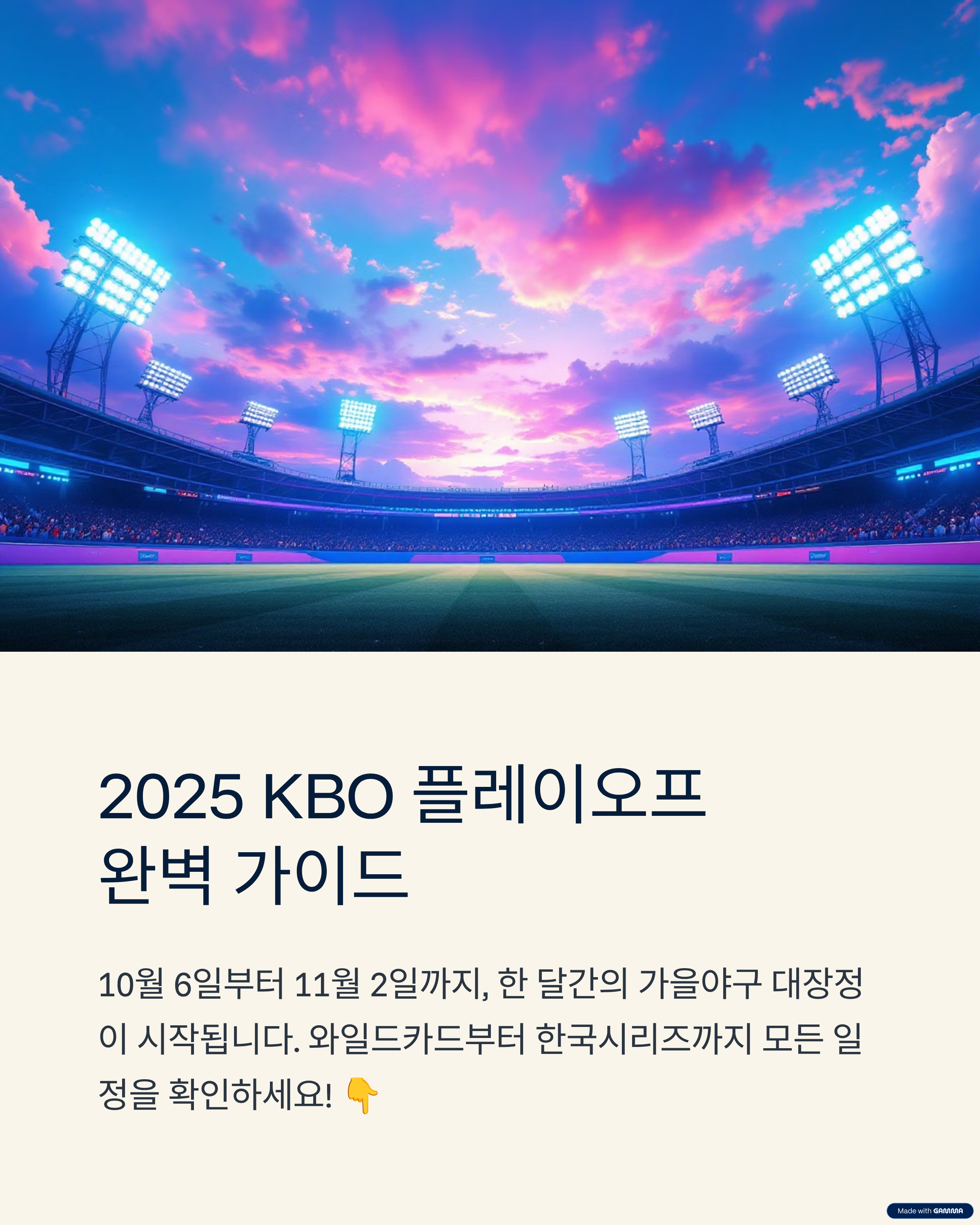 2025년 KBO 포스트시즌이 10월 6일 와일드카드 결정전을 시작으로 한 달간의 가을야구 대장정을 시작합니다. 본문에서는 와일드카드부터 한국시리즈까지의 전체 일정, 경기 방식, 대진표, 관전포인트까지 상세히 정리했습니다.