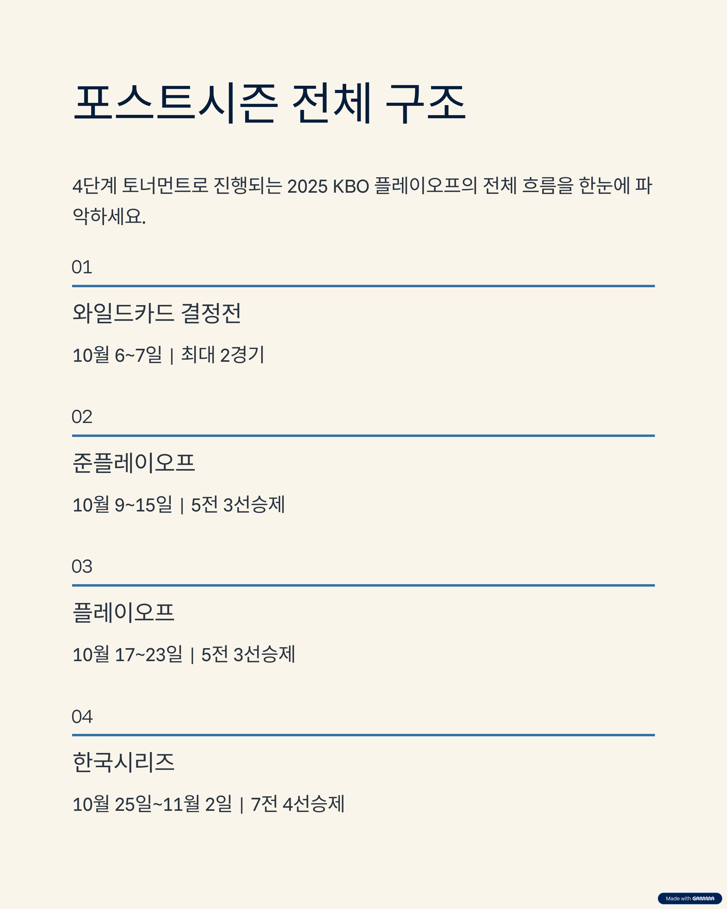 2025년 KBO 포스트시즌은 총 4단계로 구성되며, 토너먼트 방식으로 진행됩니다.