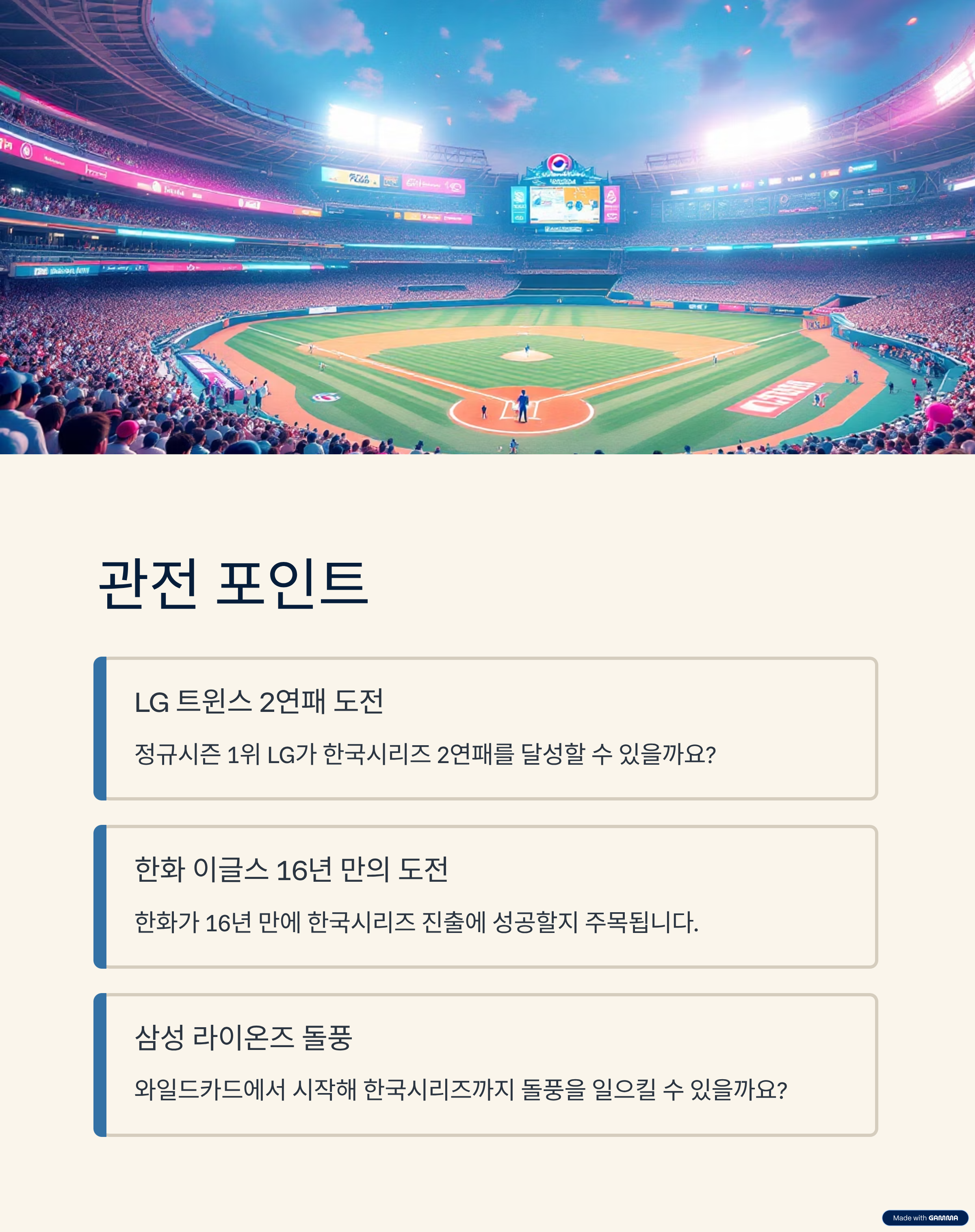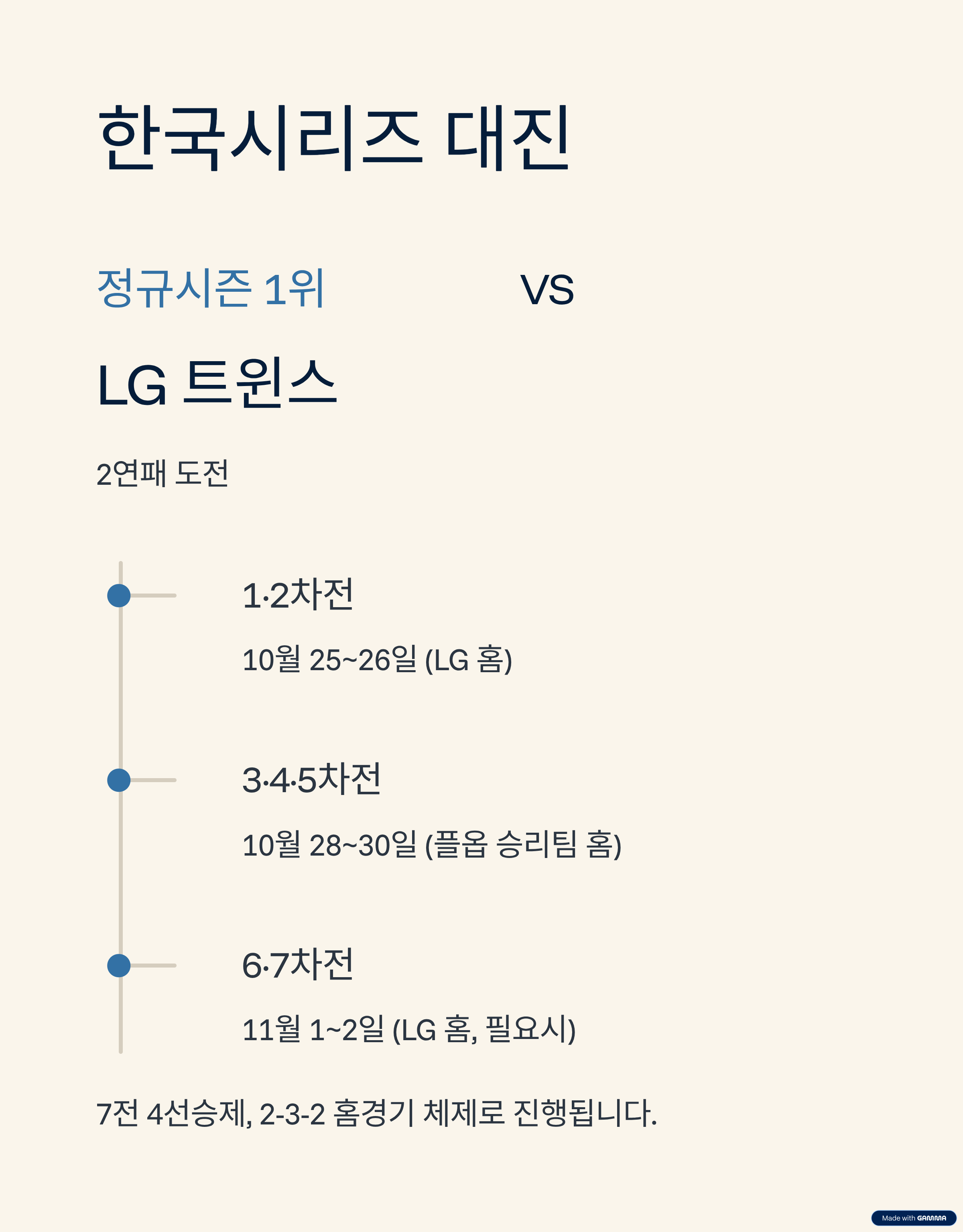 - 대진: 정규시즌 1위 LG 트윈스 vs 플레이오프 승리팀