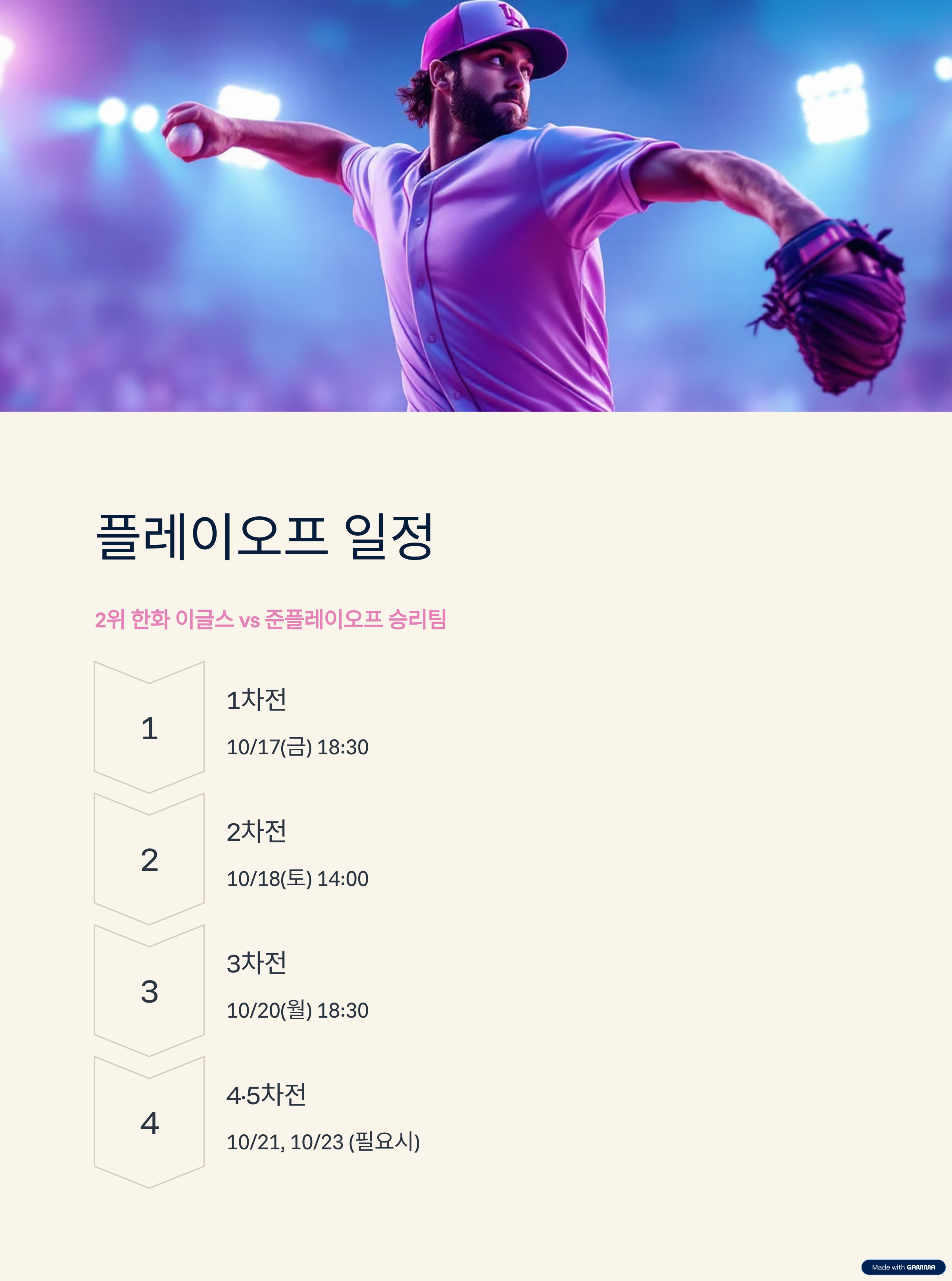 - 대진: 정규시즌 2위 한화 이글스 vs 준플레이오프 승리팀