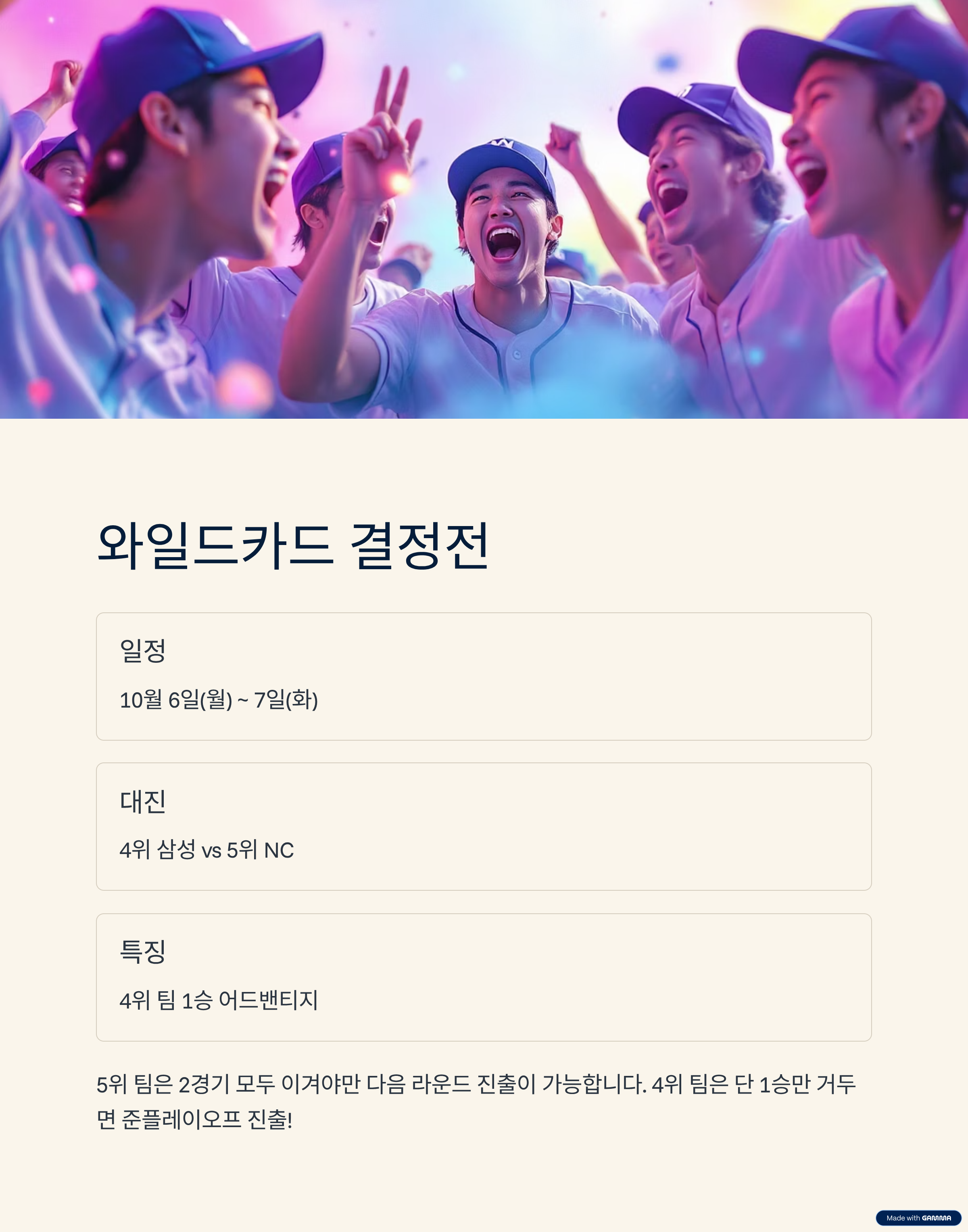 - 대진: 4위 삼성 라이온즈 vs 5위 NC 다이노스 (예시)