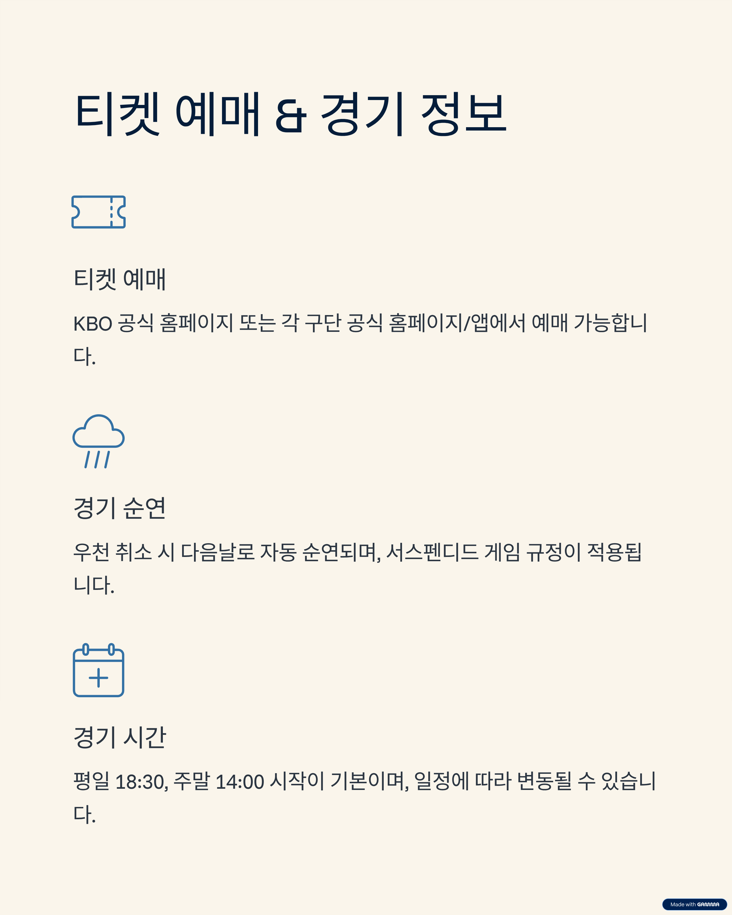 A. 비 또는 우천으로 인한 취소 시 다음날로 자동 순연되며, 서스펜디드 게임(중단 경기 재개 규정)이 적용됩니다.