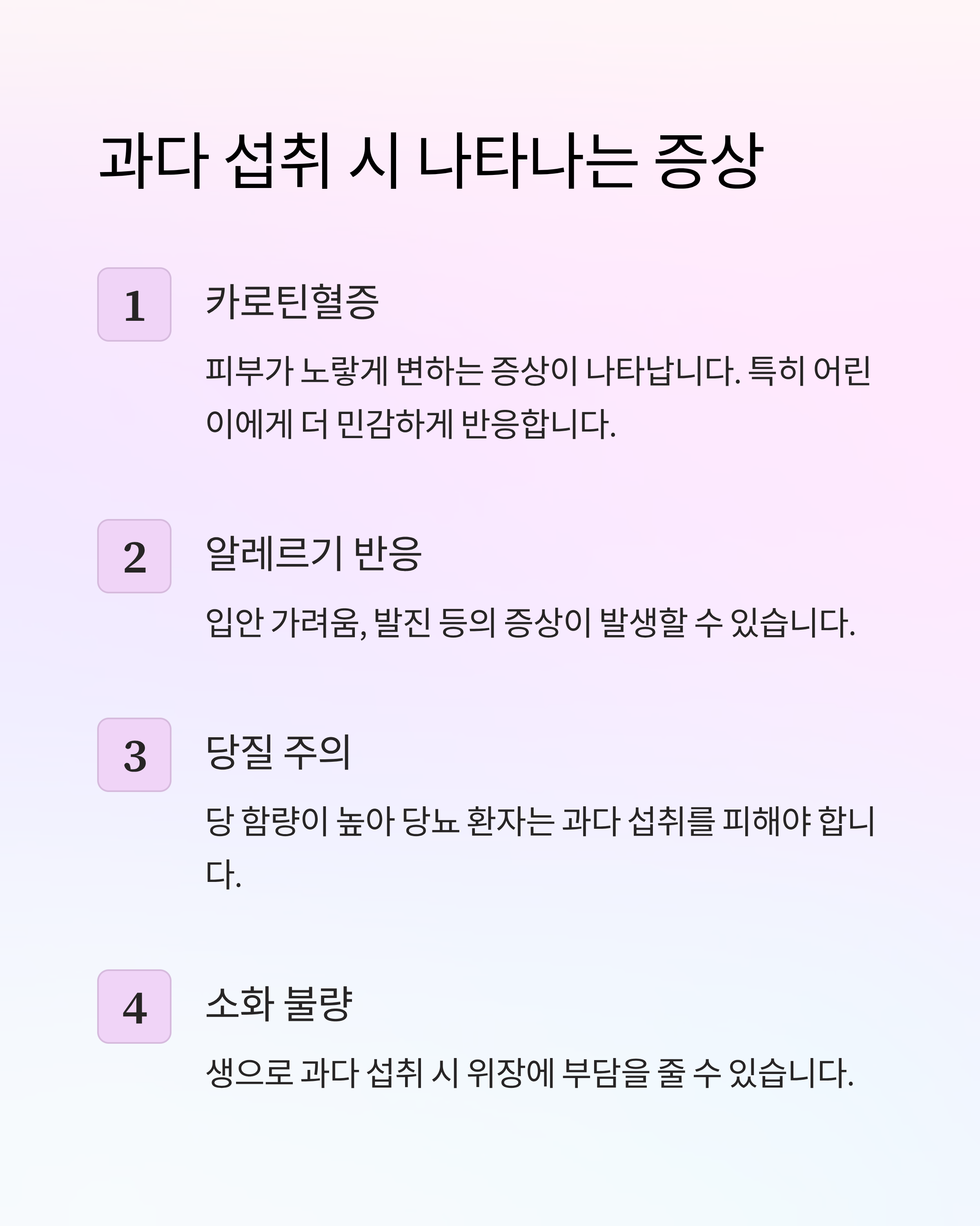 지나치게 많이 섭취하면 "피부가 노랗게 변하는 증상(카로틴혈증)"이 발생할 수 있습니다. 특히 어린이에게 더 민감하므로 적정량 섭취가 중요합니다.
