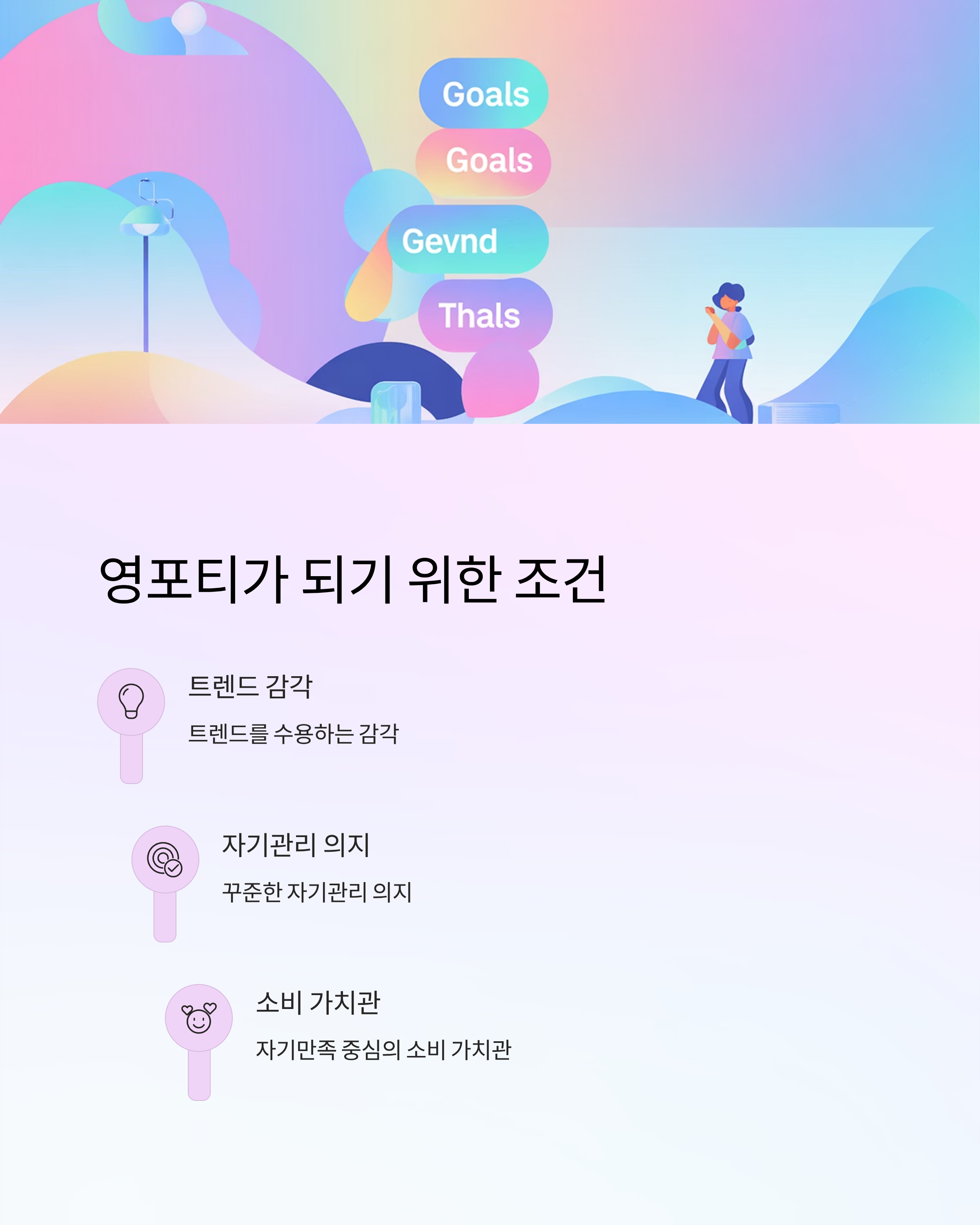 A3. 트렌드를 수용하는 감각, 자기관리 의지, 그리고 자기만족 중심의 소비 가치관이 필요합니다.