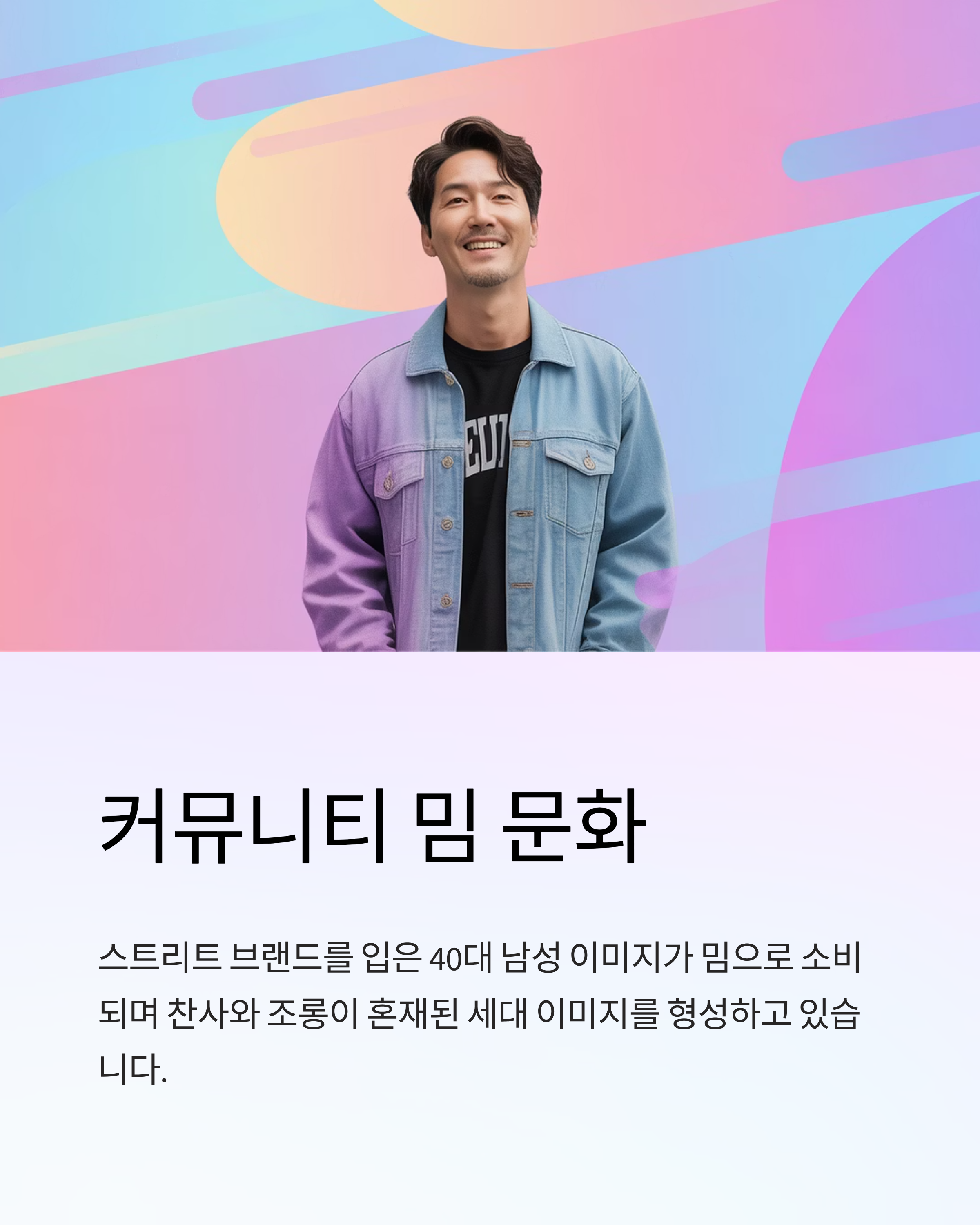 - 커뮤니티에서는 주로 스트리트 브랜드를 입은 40대 남성 이미지와 함께 밈으로 소비되기도 합니다.