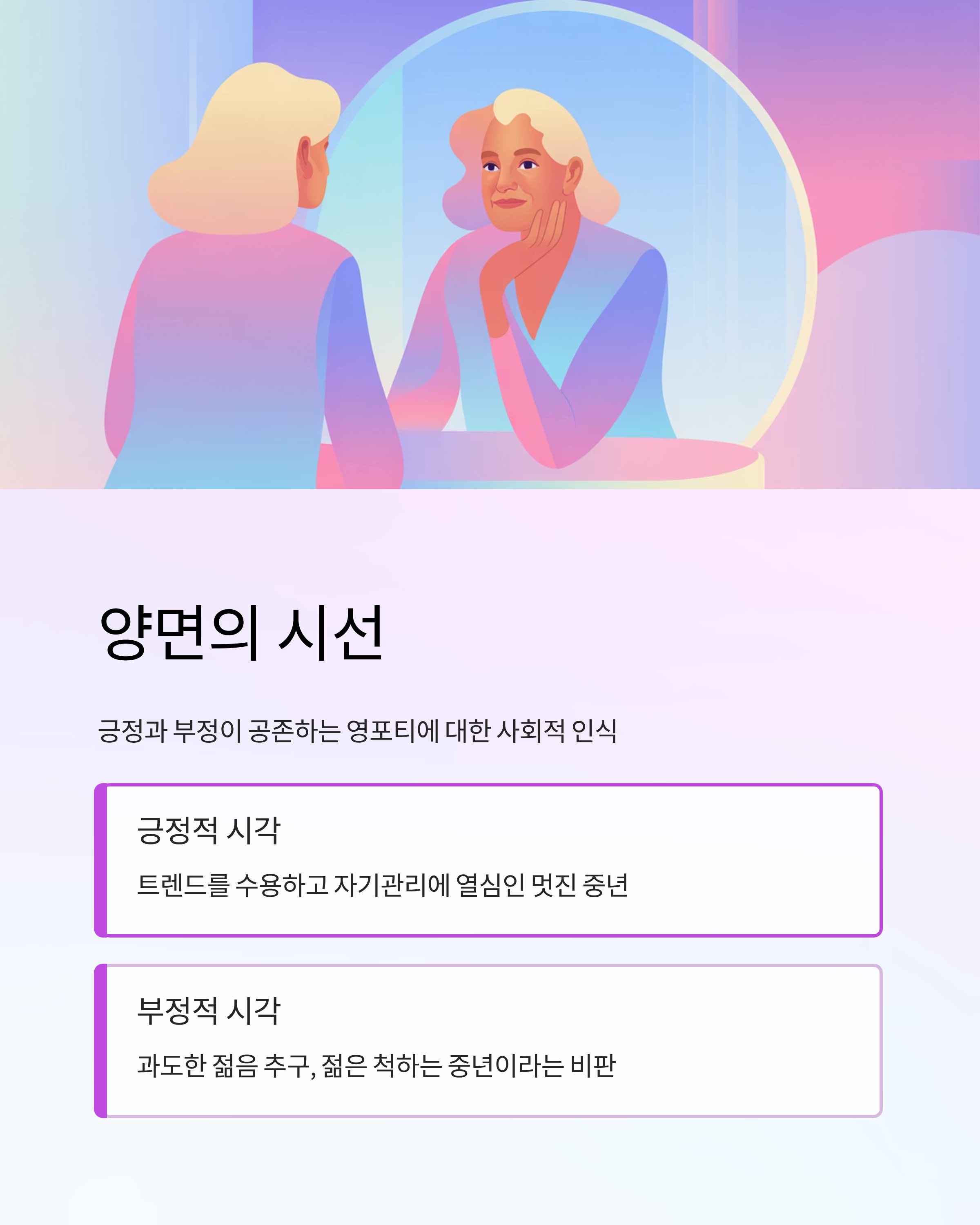 - 최근에는 과도한 젊음 추구, 젊은 척하는 중년이라는 부정적인 시선도 함께 존재합니다.