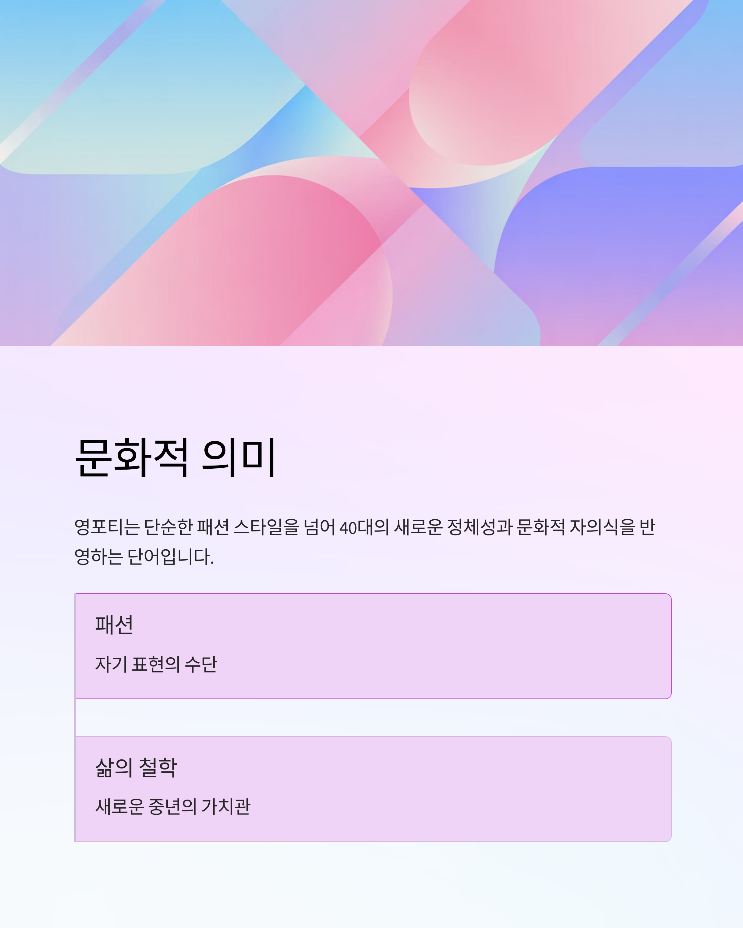 ‘영포티’는 단순한 패션 스타일을 넘어, 40대의 새로운 정체성과 문화적 자의식을 반영하는 단어입니다.