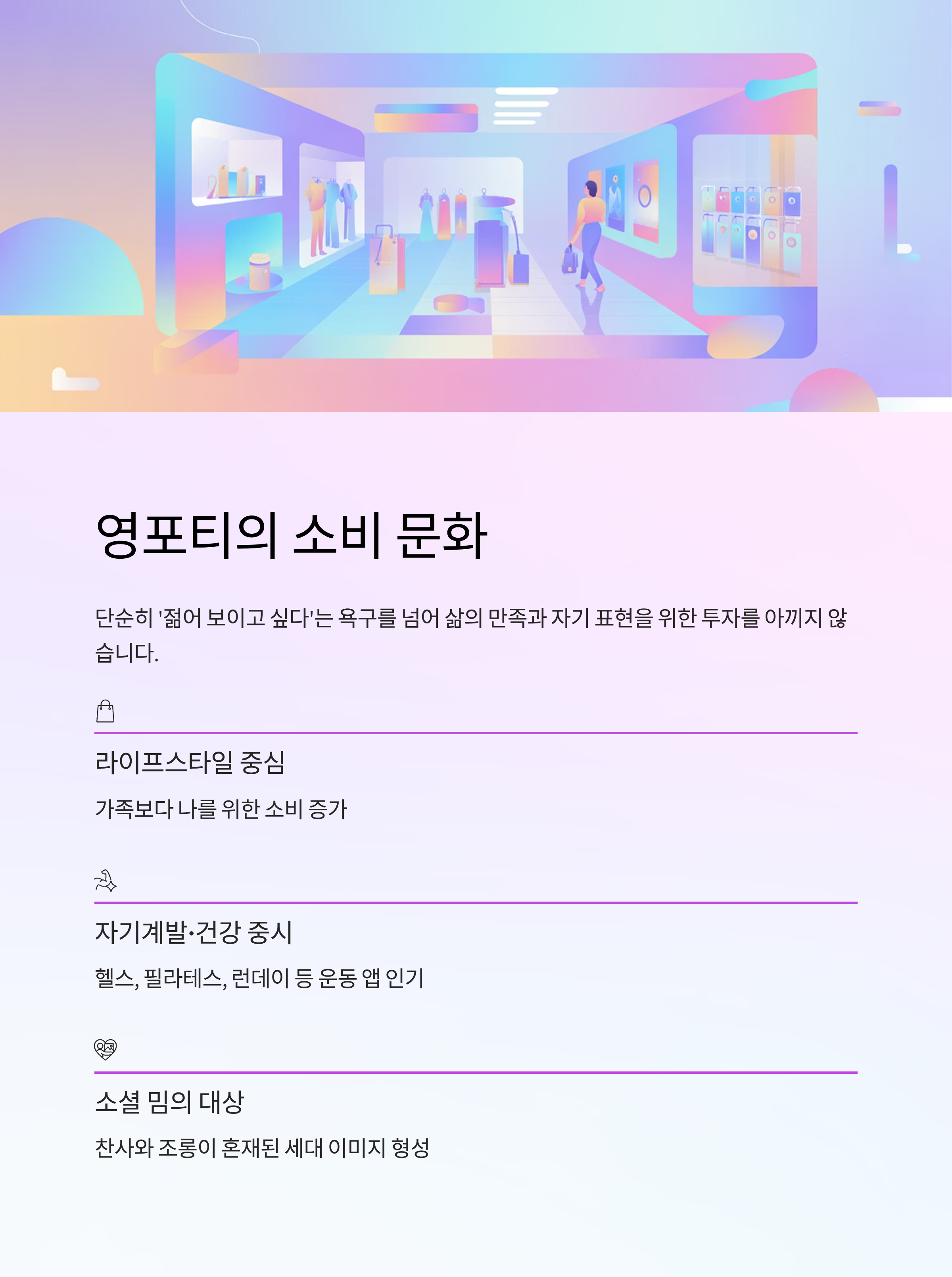 - 라이프스타일 중심: 가족보다 나를 위한 소비 증가