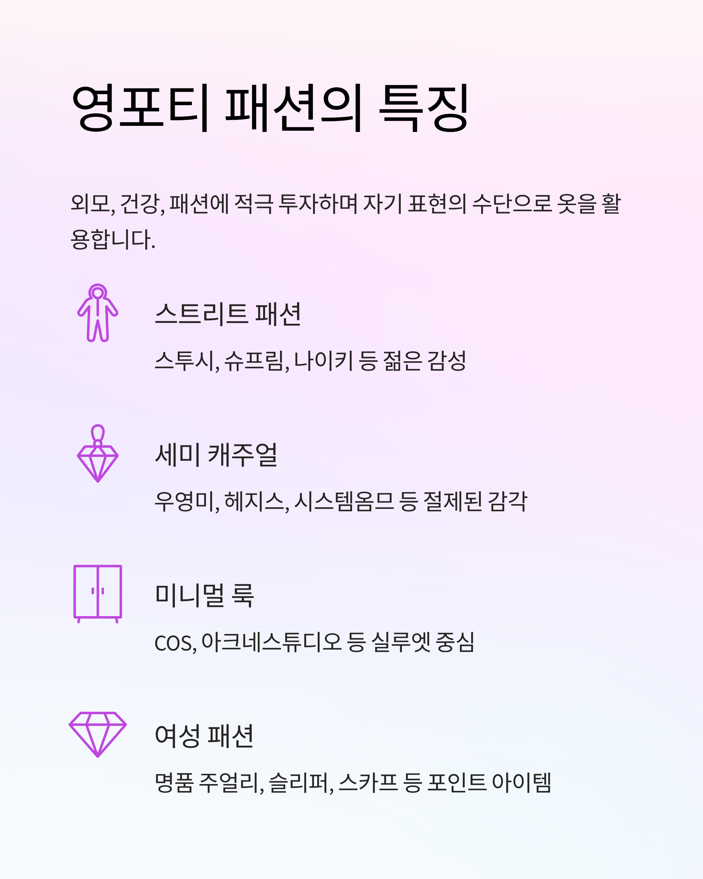 영포티 세대는 외모, 건강, 패션에 적극 투자하며 자기 표현의 수단으로 옷을 활용합니다.