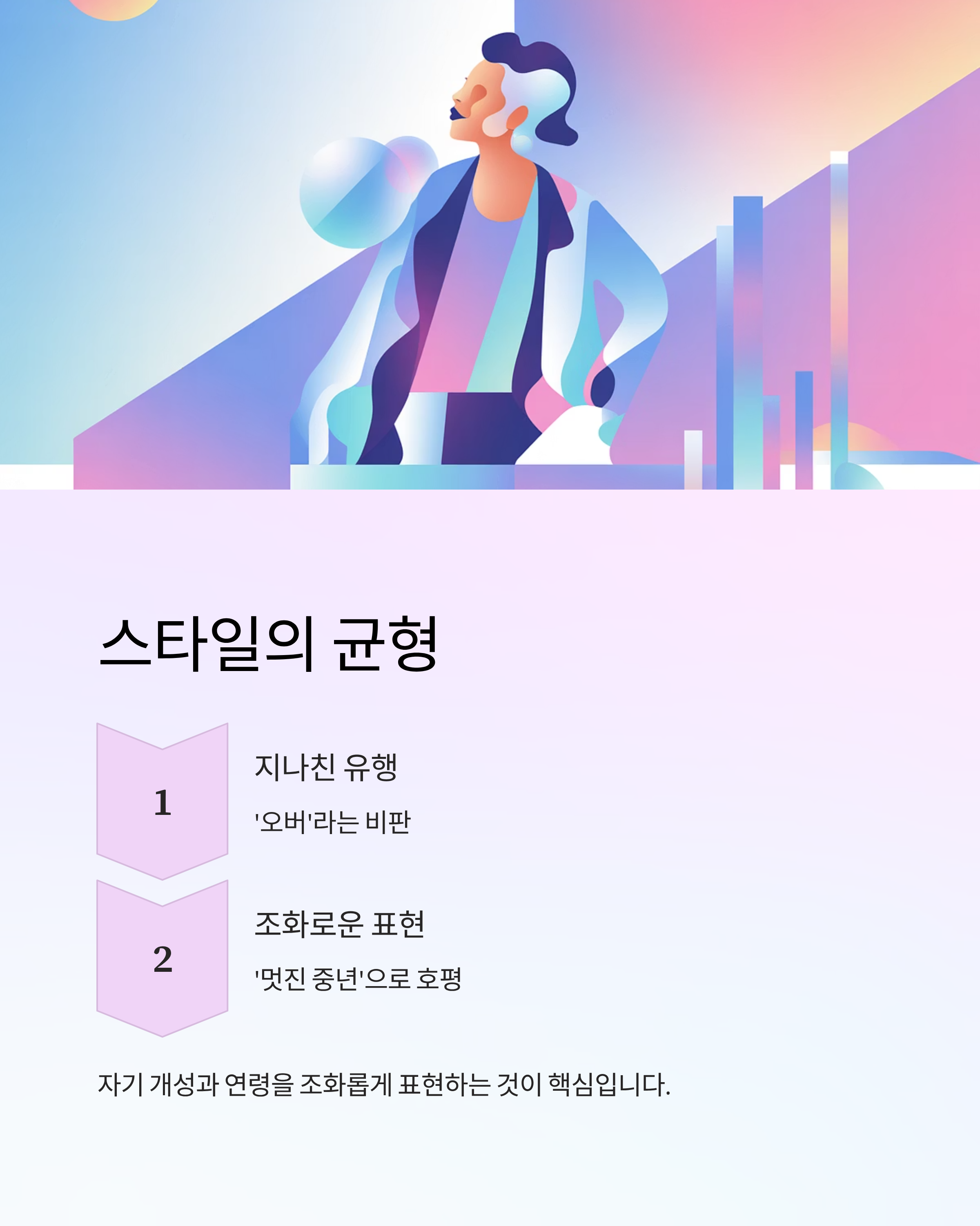 👉 지나치게 유행을 좇는 스타일은 ‘오버’라는 비판도 받지만, 자기 개성과 연령을 조화롭게 표현하는 스타일은 ‘멋진 중년’으로 호평받습니다.