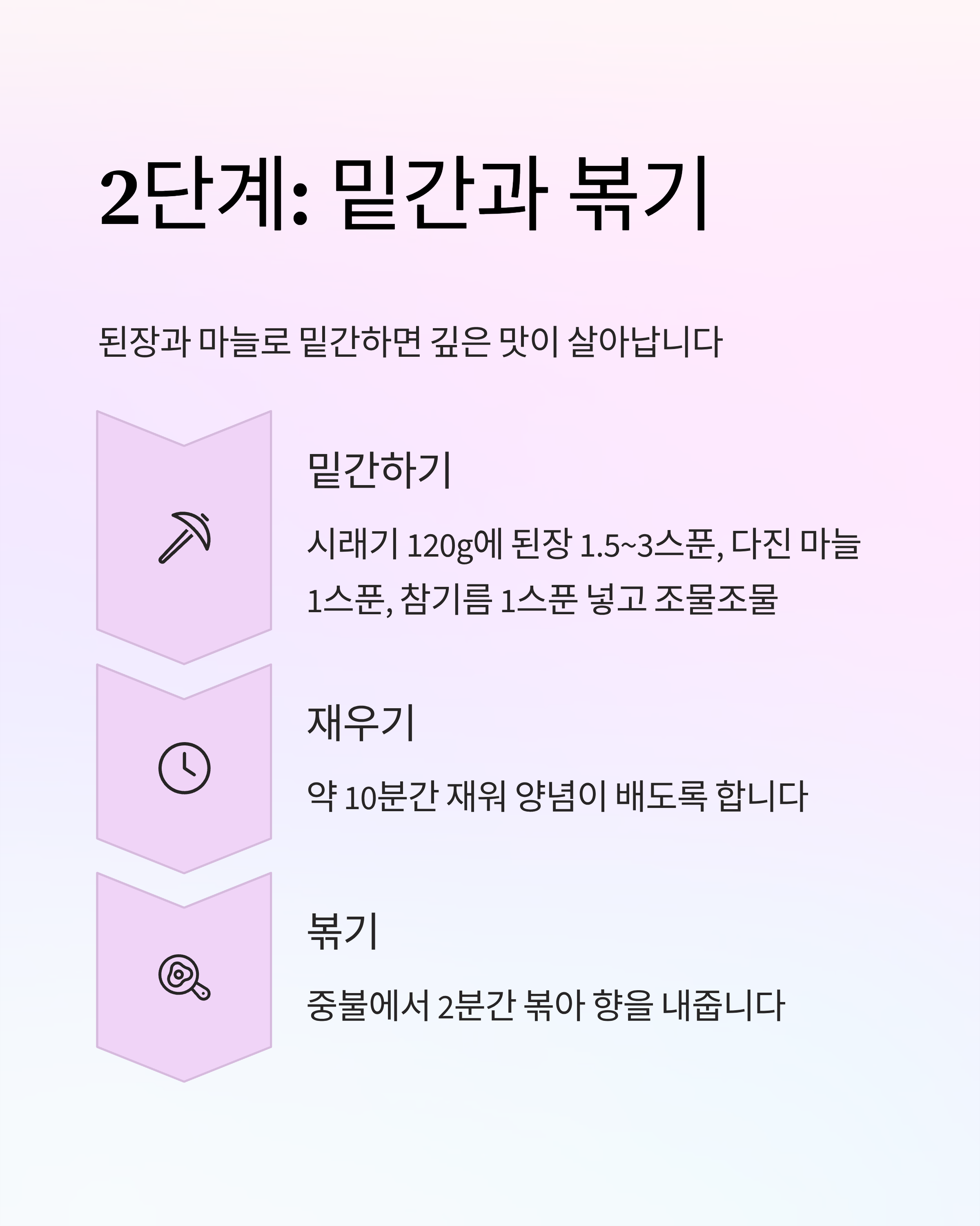 시래기는 그냥 끓이는 것보다 된장과 마늘로 밑간해서 볶은 후 끓이면 훨씬 깊은 맛이 납니다.