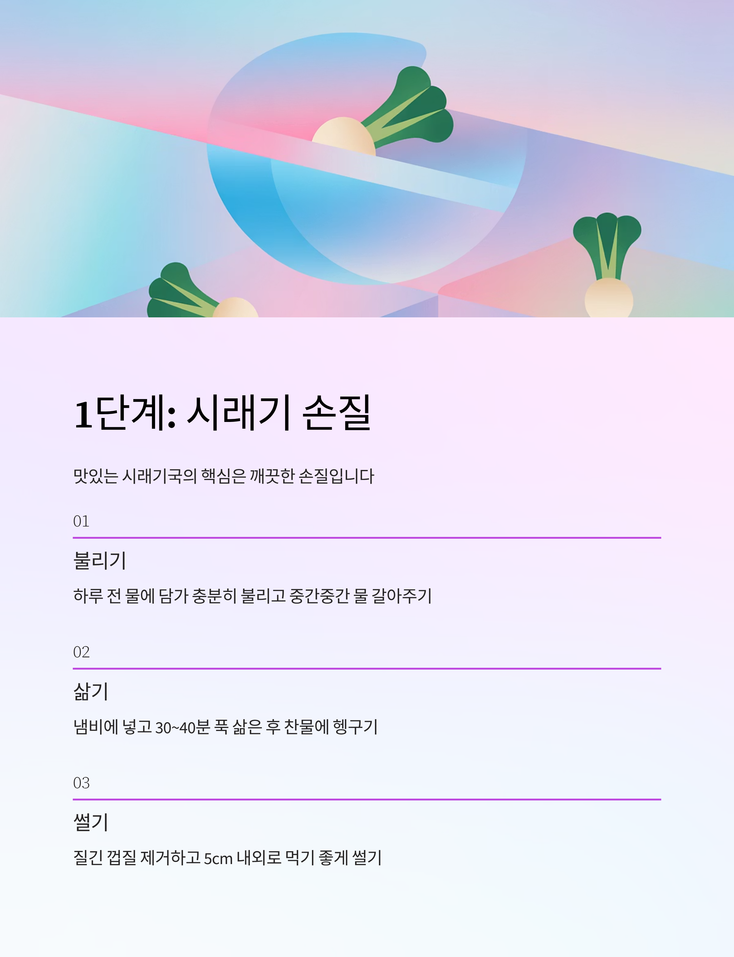 - 말린 시래기 사용 시: 하루 전 물에 담가 충분히 불리고, 중간중간 물을 갈아 이물질 제거