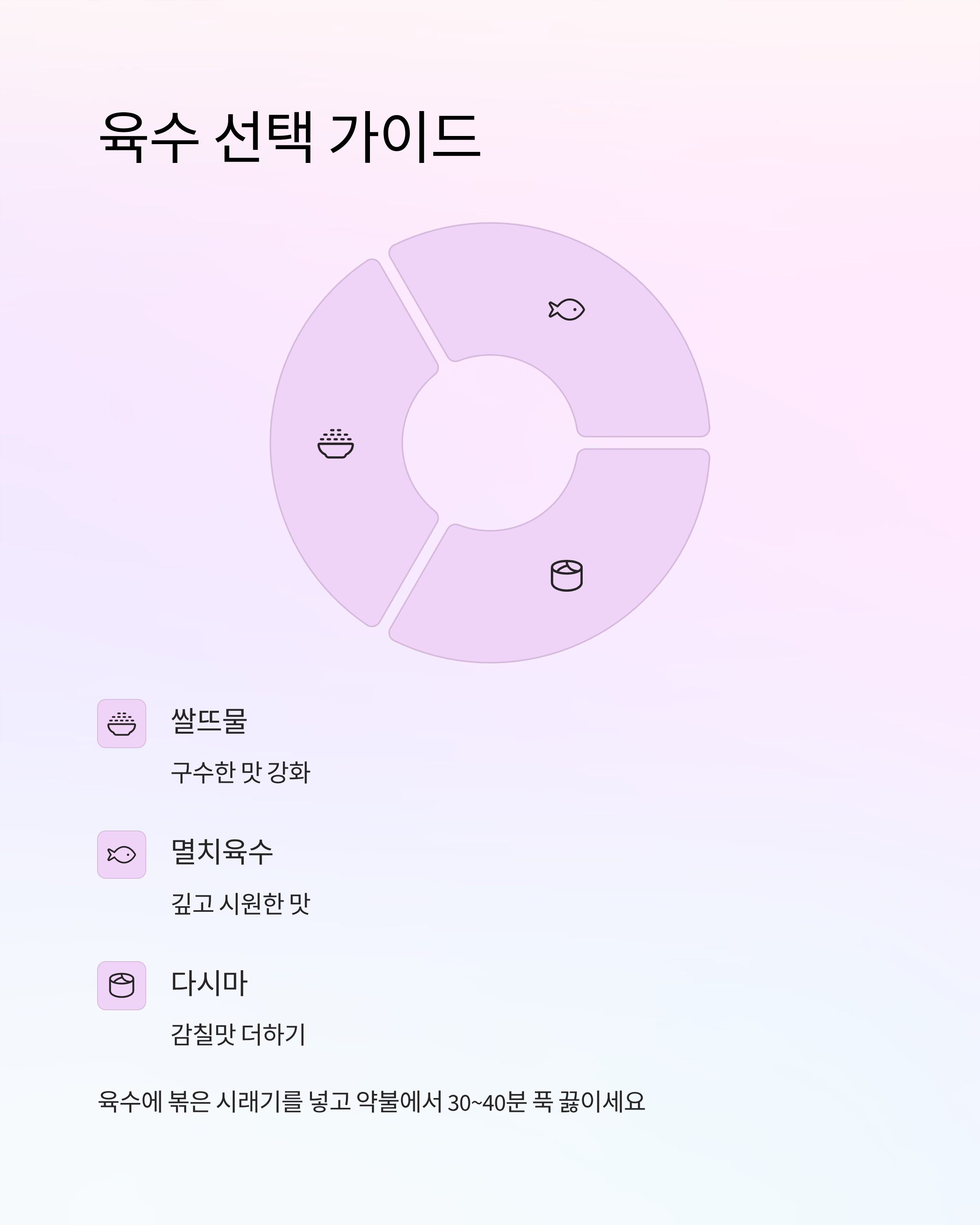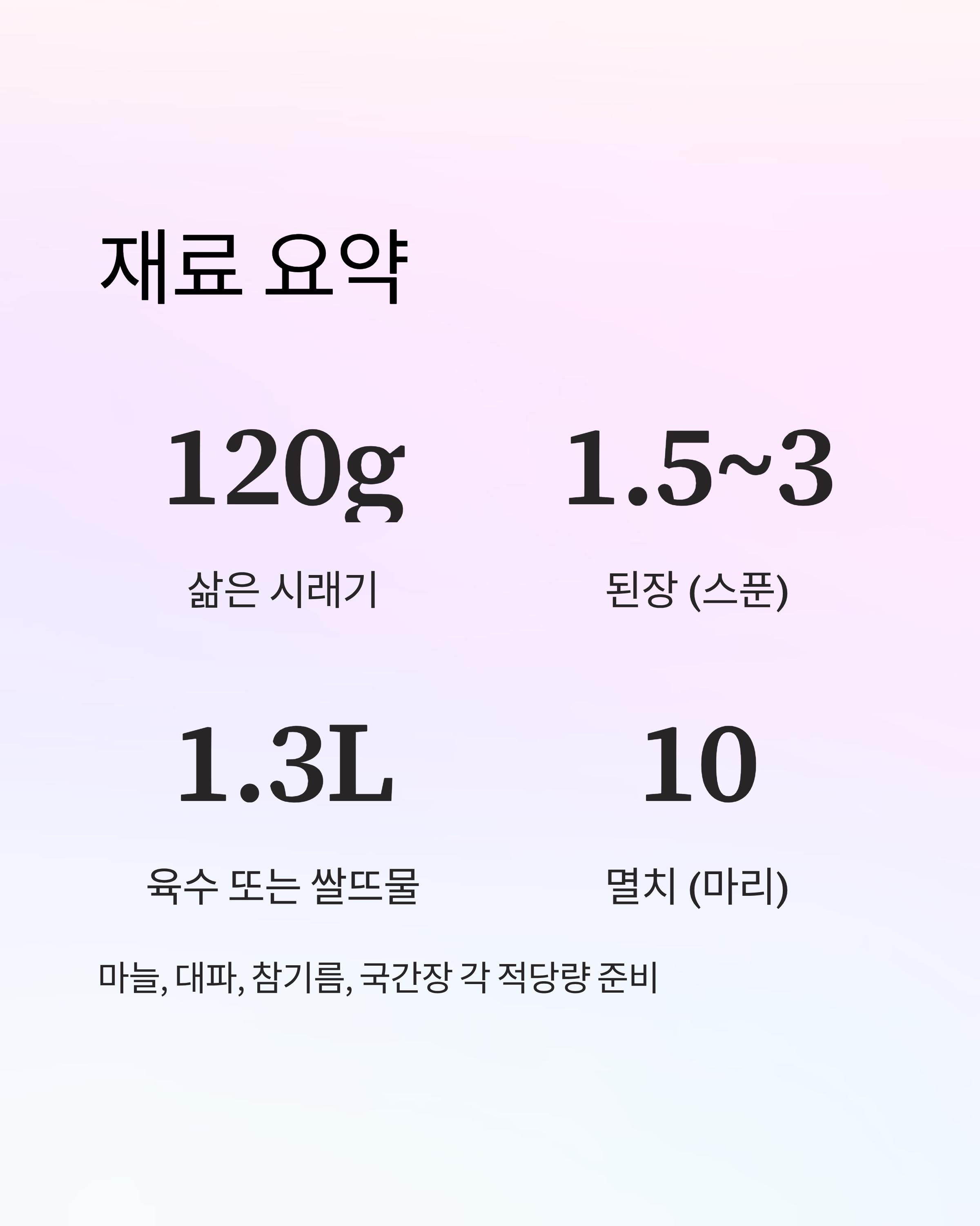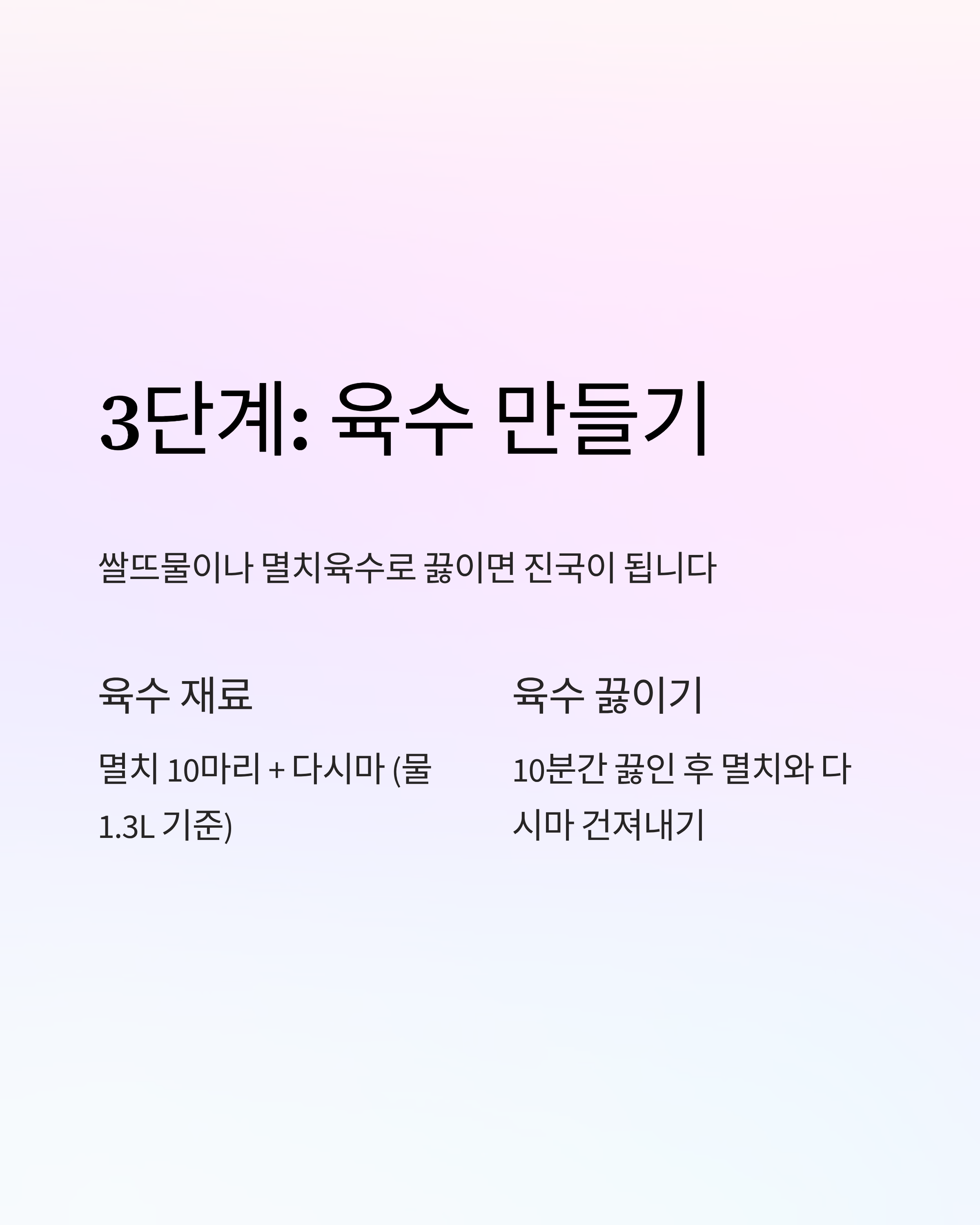- 육수 재료: 멸치 10마리 + 다시마 (물 1.3L 또는 쌀뜨물 6컵 기준)