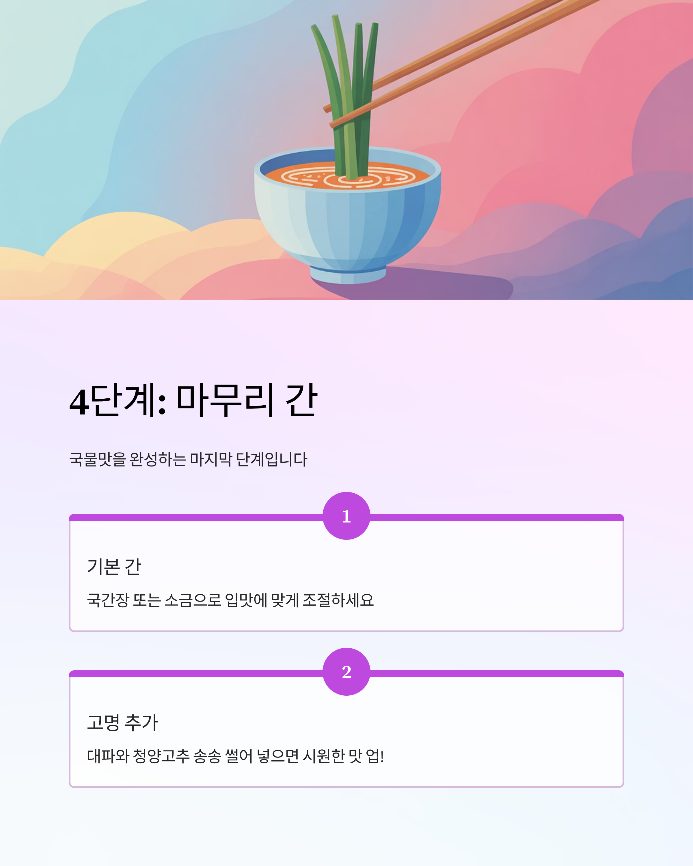 - 간: 국간장 또는 소금으로 입맛에 맞게 조절