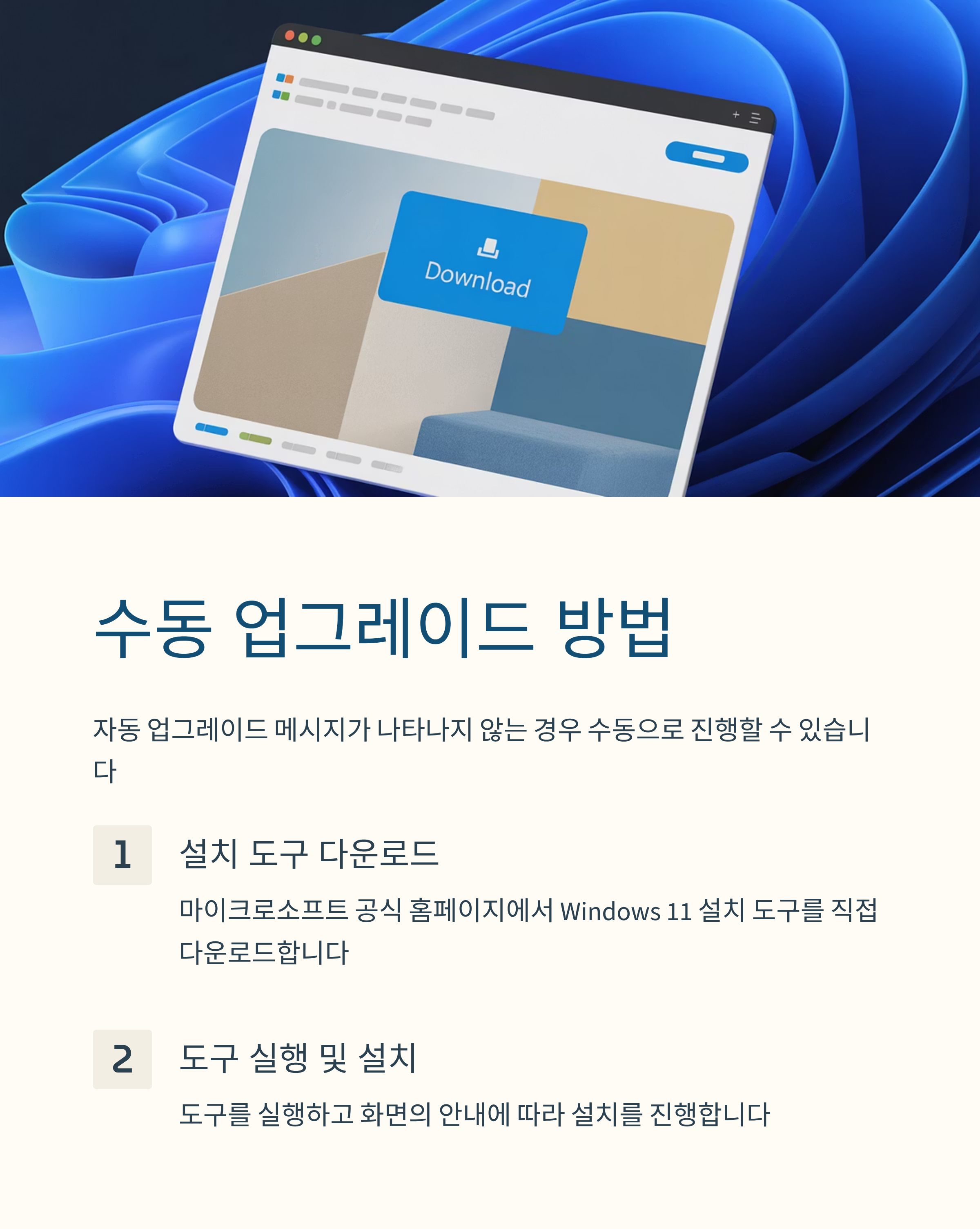 → 마이크로소프트 공식 홈페이지에서 ‘Windows 11 설치 도구’ 직접 다운로드 - 도구 실행 후 화면 안내에 따라 설치 진행