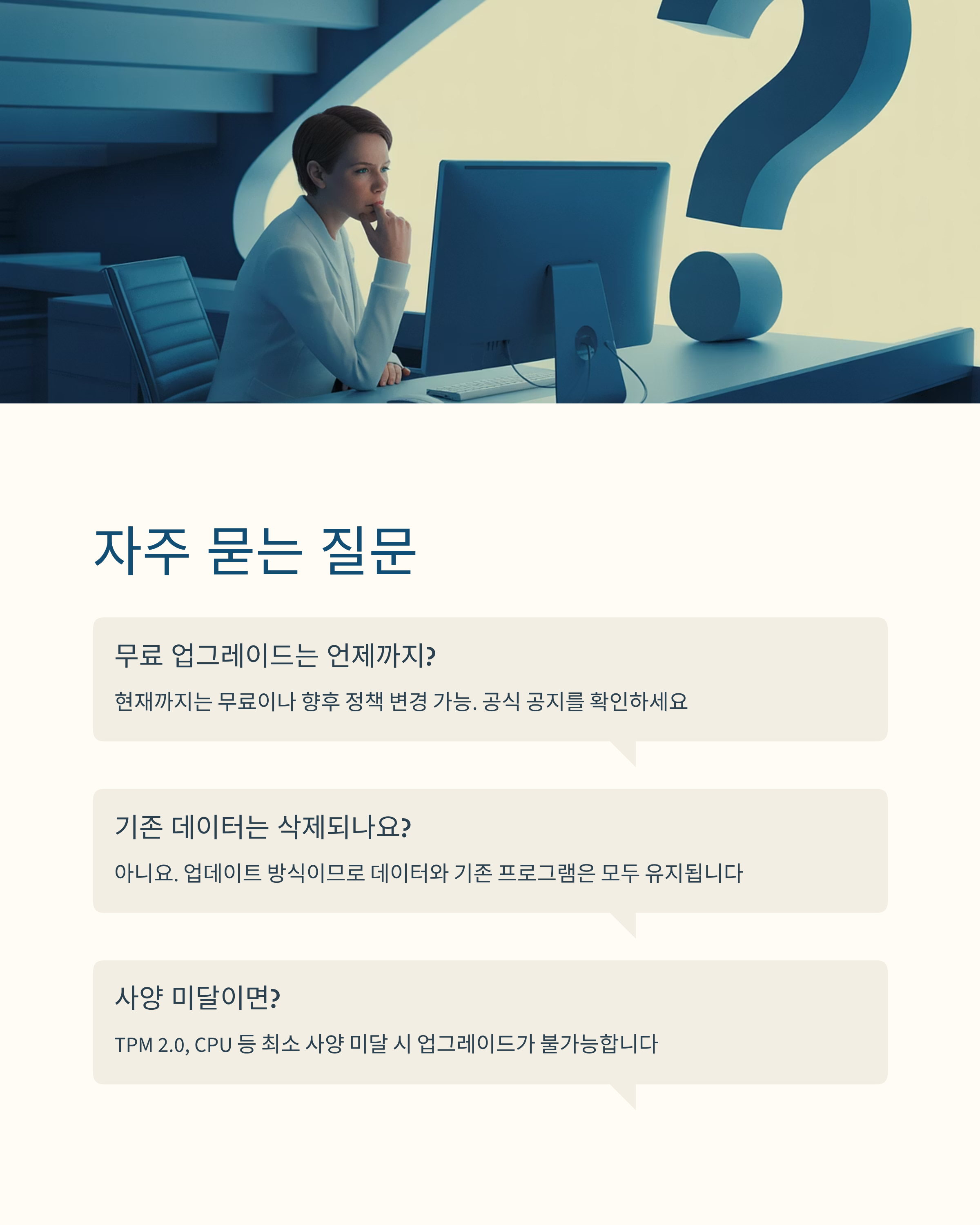 → 네. TPM 2.0, CPU 등 최소 사양 미달 시 업그레이드 불가