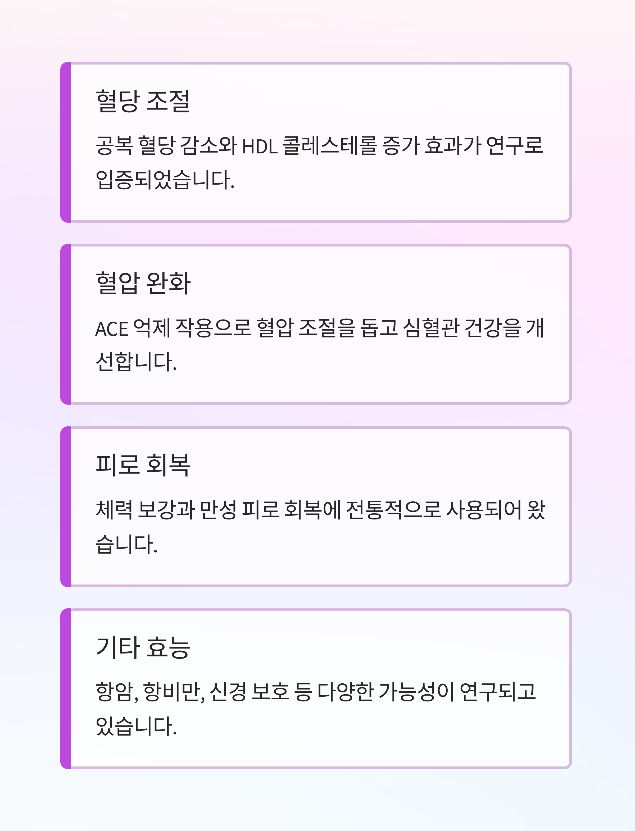 - 특히 항산화 작용을 통해 만성 피로나 스트레스로 인한 손상 회복에 도움을 줄 가능성이 제시됩니다.